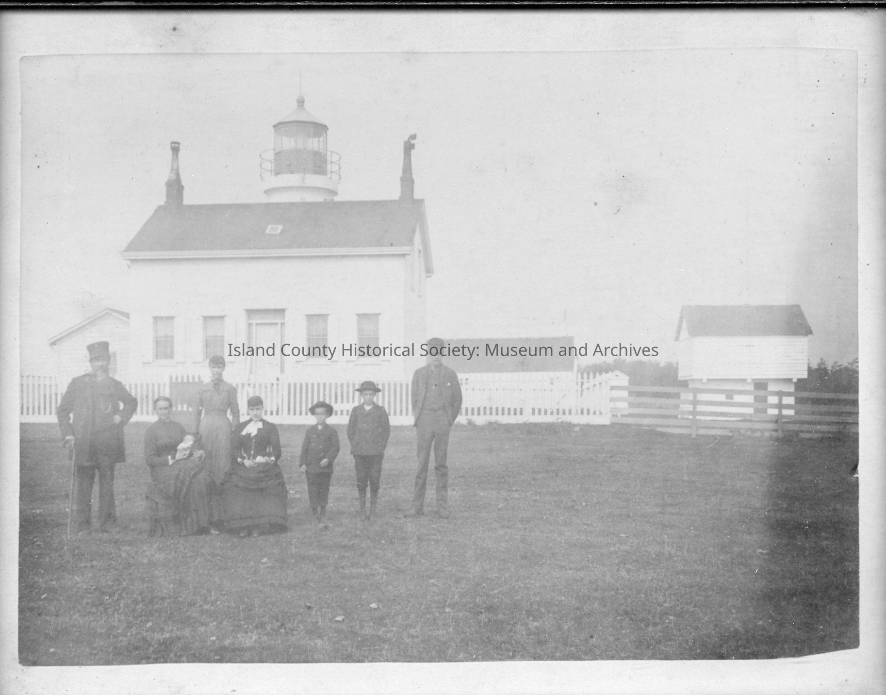 sepia photo of Smith Island Lighthouse w/ unidentified family sitting out front - in gold/black framePhotograph Details