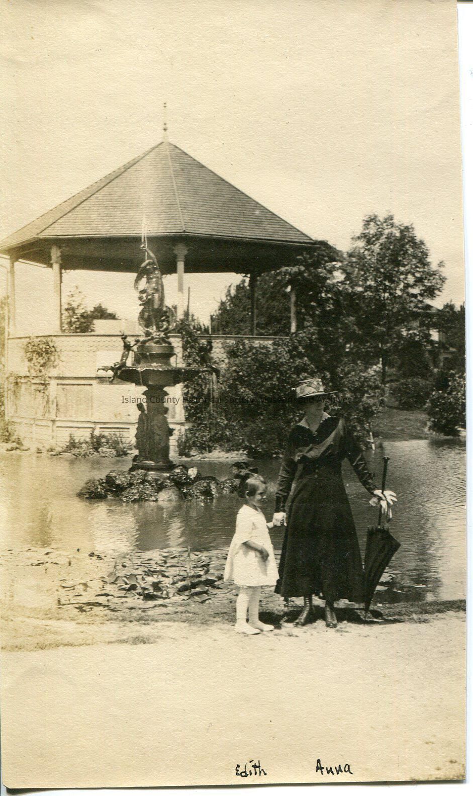 A black and white photo of a woman standing next to a little girl. They are standing in front of a fountain that is in the middle of a large pond. The little girl is wearing a white dress and shoes and she is holding onto the woman's hand. The woman is wearing a black dress and shoes and she is holding an umbrella in her other hand. Neither are looking at the camera. The bottom of the photo says, "Edith, Anna". Anna Kellogg Elder and Edith her daughter.