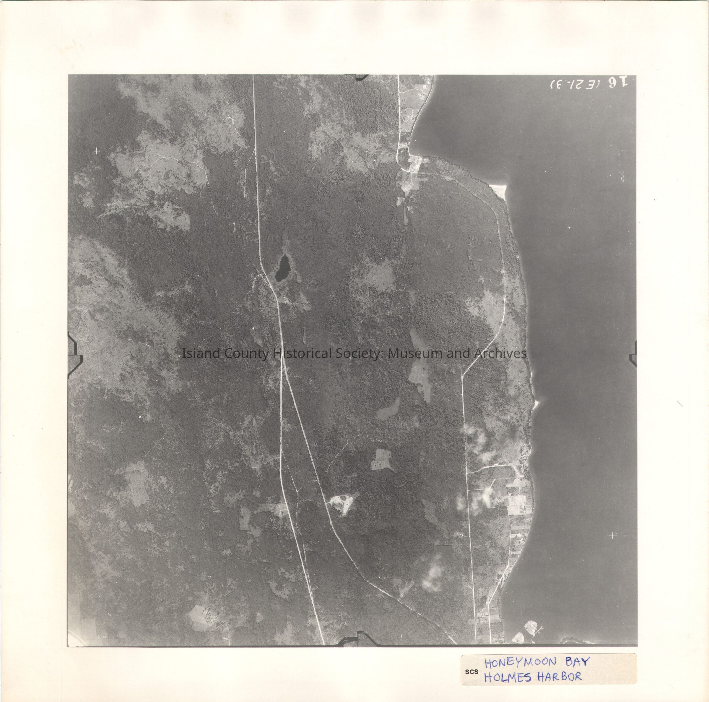 Donated by Island Conservation District 16 (21-3) Adjacent to 2015.023.174 and .176 Photo taken 8 August 1942 Honeymoon Bay Label in ink: Honeymoon Bay Holmes Harbor Pencil X in the center See GIS for digital copies.
