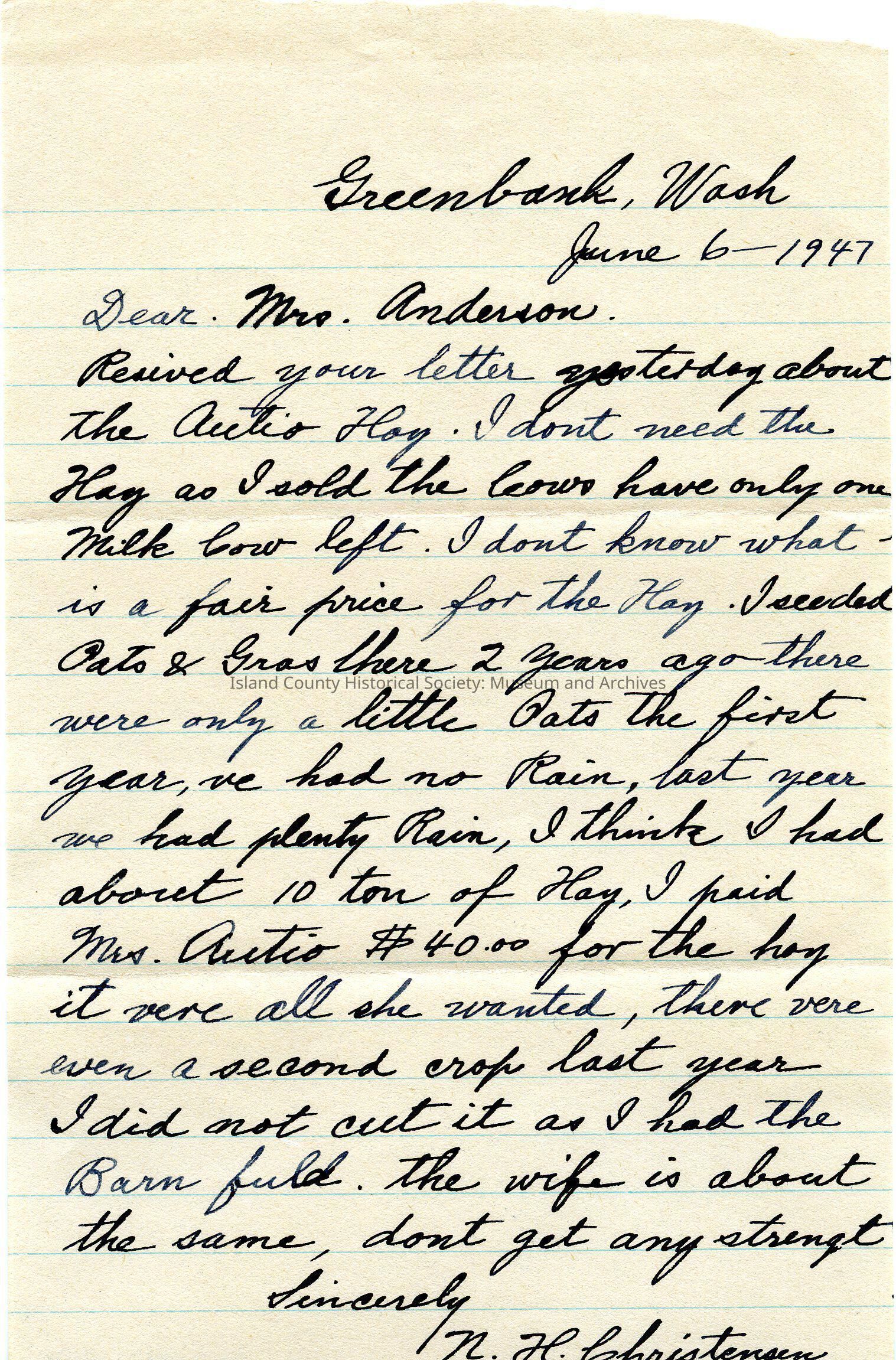 Letter to Elizabeth Anderson from N.H. Christensen, hand written in black ink June 6th 1974, one page of lined paper (torn at top). He declines her offer of hay because of lack of cows and full barn of hay already. He laments the poor crop yields.
