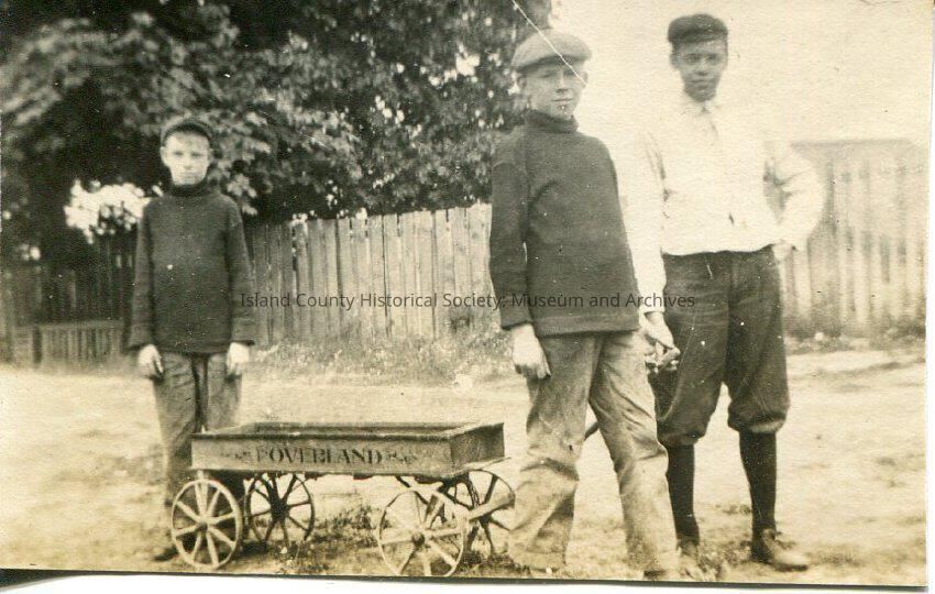 A black and white photo of three boys with a wagon. The two older boys are in front of the wagon, pulling it. The youngest boy is standing behind the wagon. All three boys are wearing hats and are looking at the camera. The back of the photo says, "Harold, Howard, Eddie Case". There is a large tree and a fence in the background.Made/Created