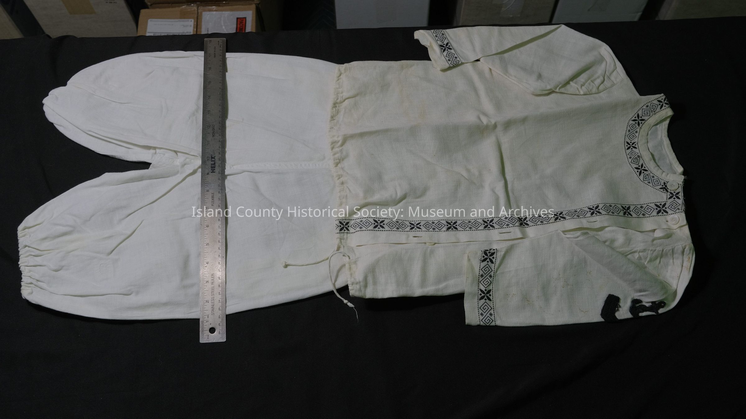 White linen sailor blouse with black figured trim.