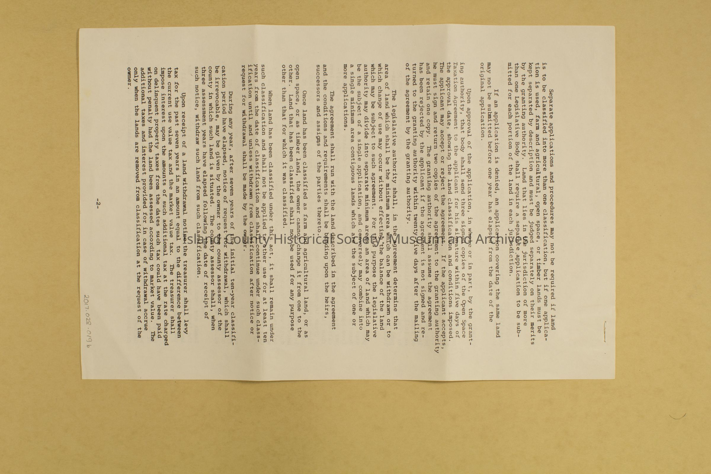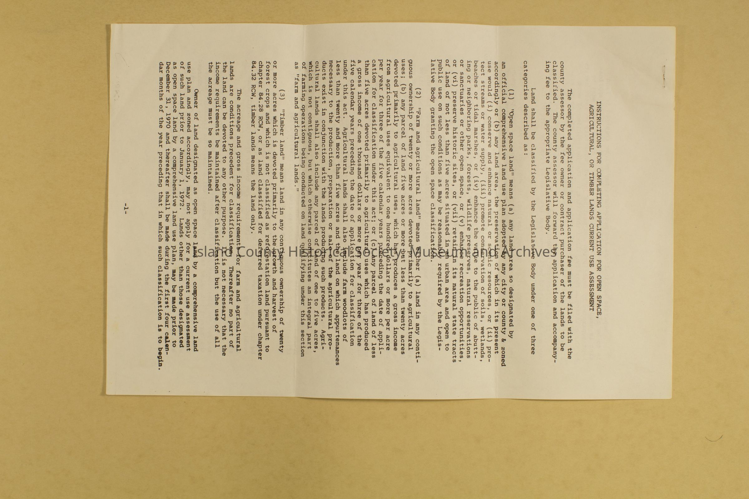 Application instruction sheet for completing application for open space, agricultural, or timber lands current use assessment. Both sides printed detailing definitions of words used in the act and requirements for the application. Page 1-2.
