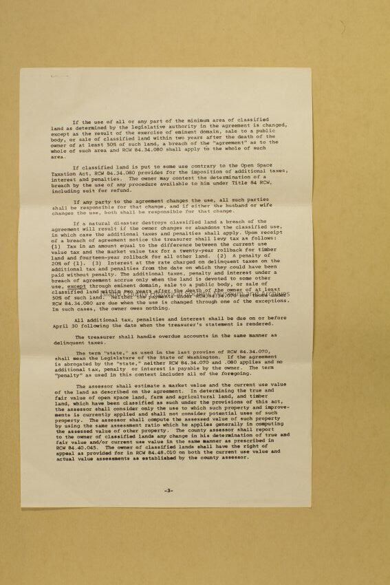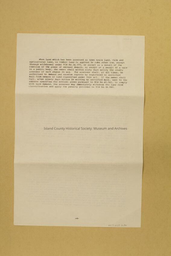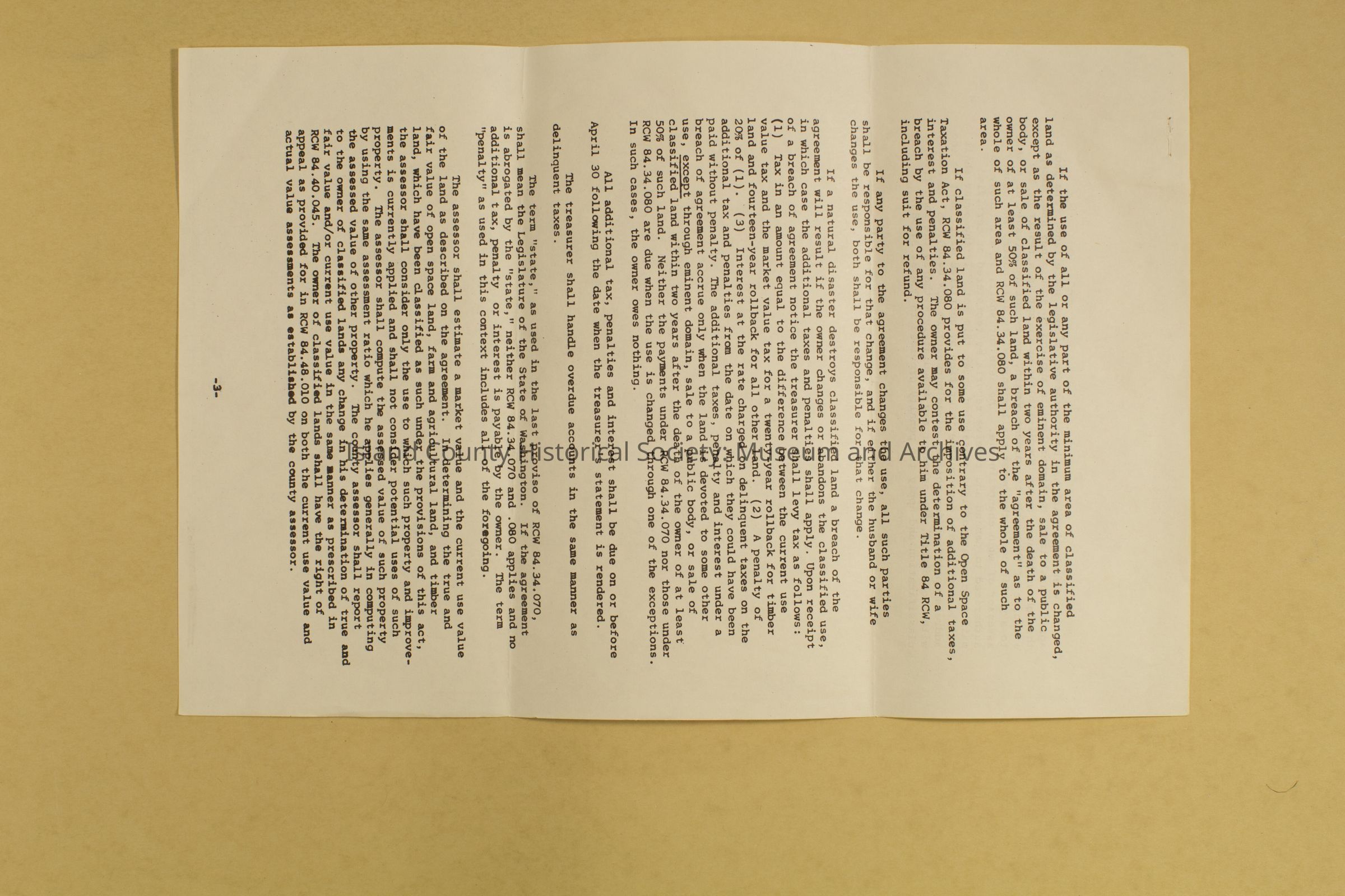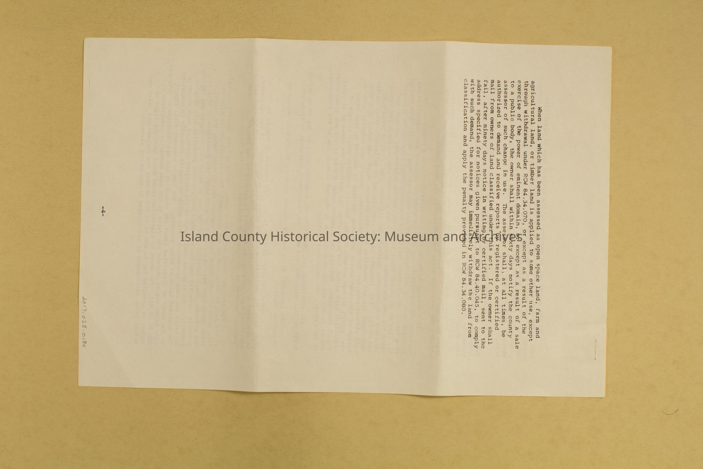 Application instruction sheet for completing application for open space, agricultural, or timber lands current use assessment. Both sides printed detailing definitions of words used in the act and requirements for the application. Page 3-4.