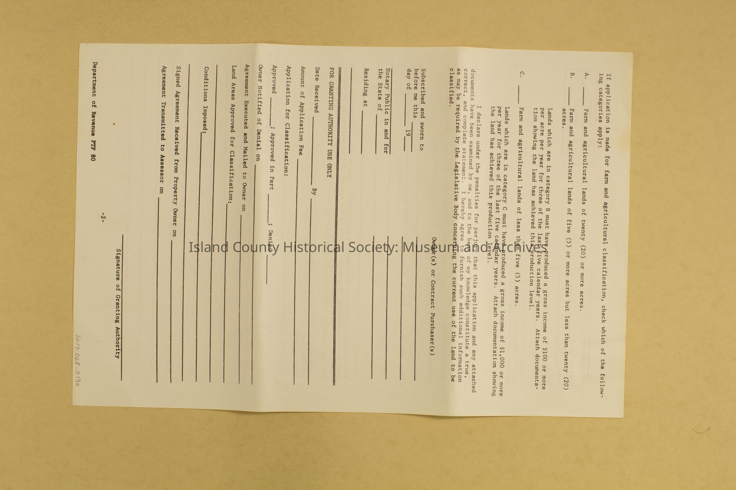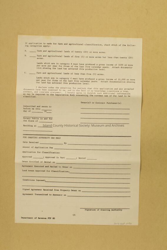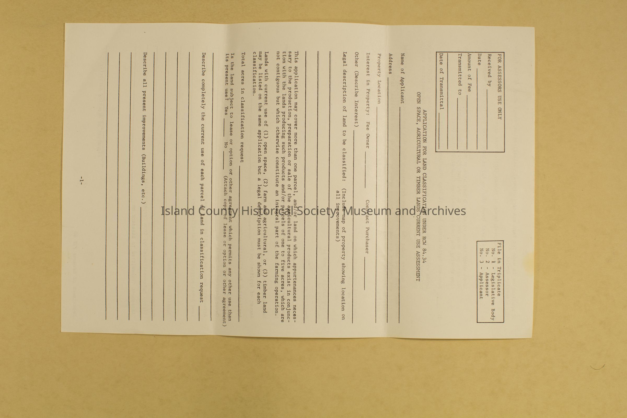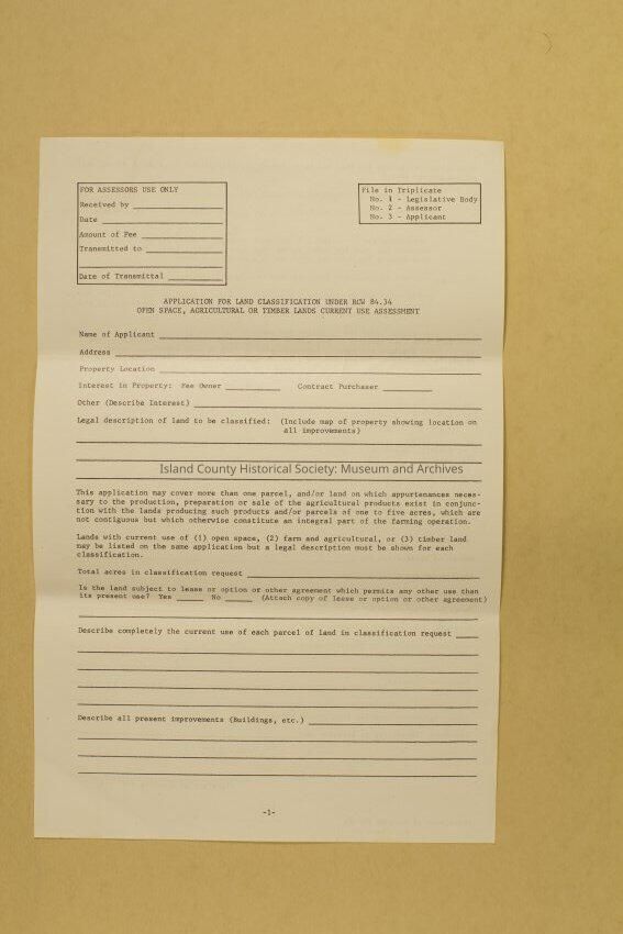 Application form for land classification under RCW 84.34 open space, agricultural or timber lands current use assessment. Both sides printed on. Pages 1-2. Identical to 2017.028.19d and f