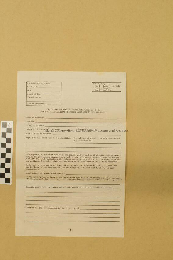 Application form for land classification under RCW 84.34 open space, agricultural or timber lands current use assessment. Both sides printed on. Pages 1-2. Identical to 2017.028.19d and e
