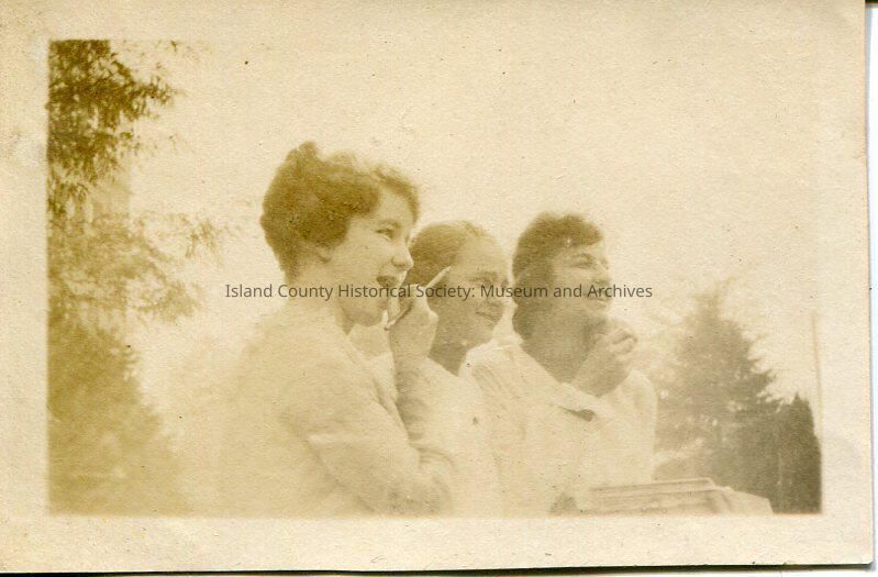 A faded photo of thee women. None of the women are looking at the camera. One of the women has her hand near her mouth and there is a pencil in her hand. The woman on the other end of the photo has something (an apple?) on her neck. All three women are smiling.