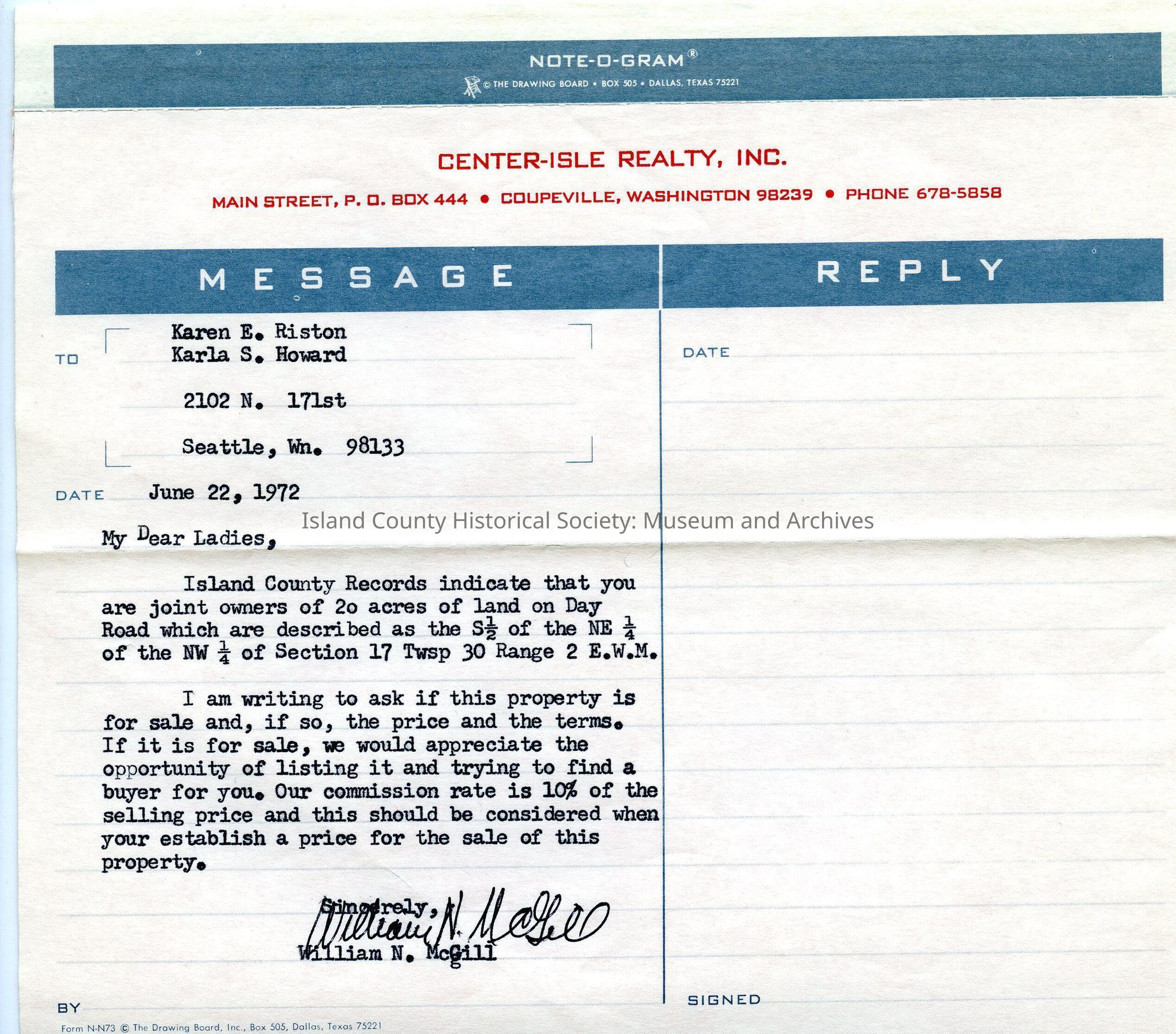 Attached to 2017.028.020d. Note-o-gram from Center-Isle Realty Inc to Karen Riston and Karla Howard. A message section has typed message in it and "reply" box opposite. From William McGill June 22 1972, inquiring whether their land is for sale. White slip part.