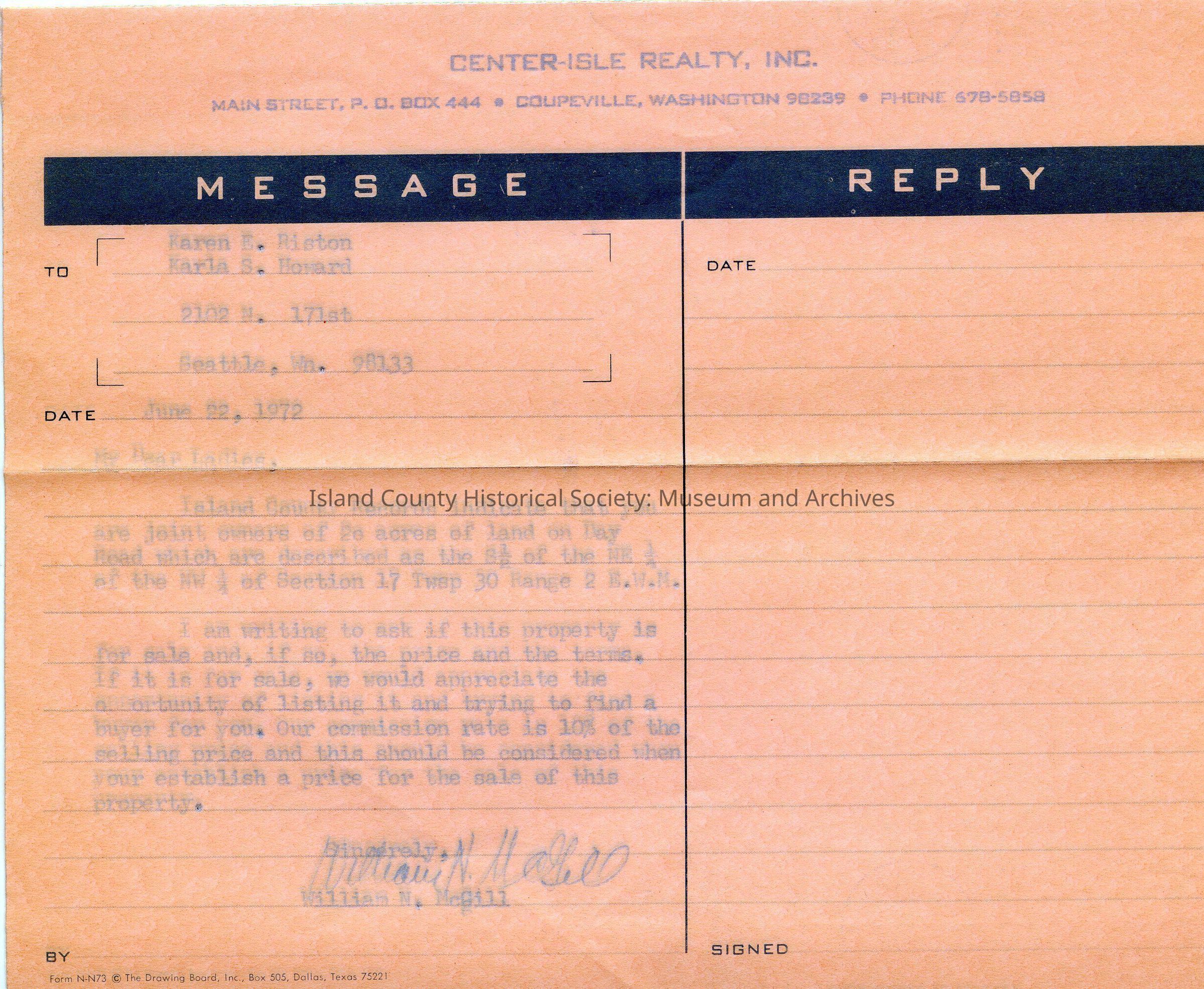 Attached to 2017.028.020c. Note-o-gram from Center-Isle Realty Inc to Karen Riston and Karla Howard. A message section has typed message in it and "reply" box opposite. From William McGill June 22 1972, inquiring whether their land is for sale. Pink slip part.
