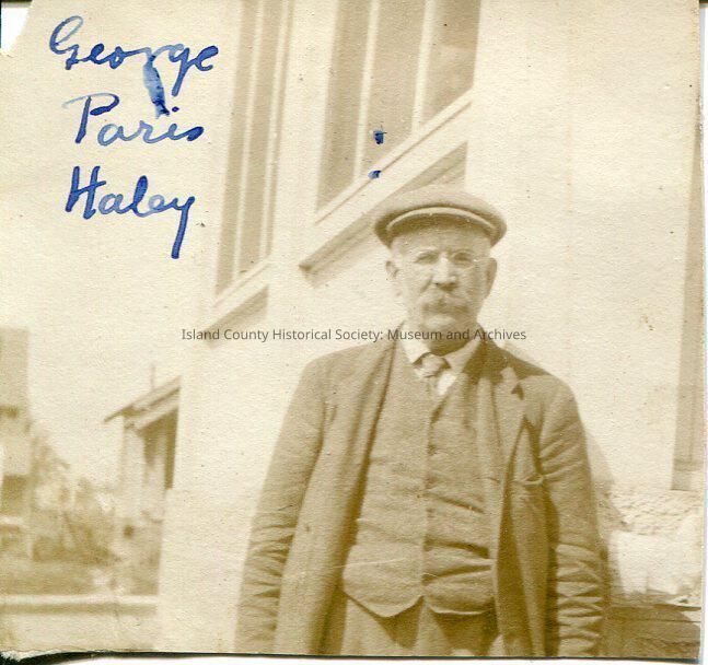A black and white photo of a man standing in front of a building. The man is wearing a suit, tie, hat, and glasses. The top-left corner of the photo says, "George Paris Haley".Made/Created