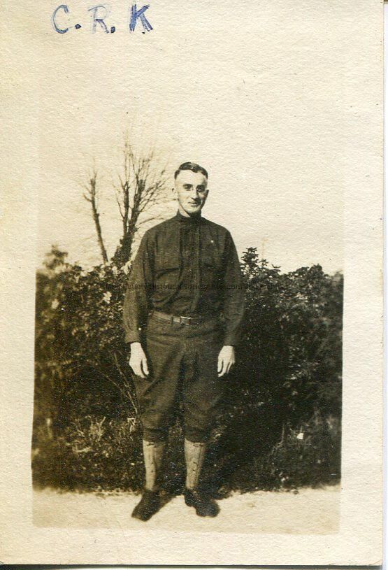 A black and white photo of a man wearing a dark-colored uniform standing in front of some bushes. The top of the photo says, "C.R.K.". Chester Ralph Kellogg. Born 1888 and died 1964.