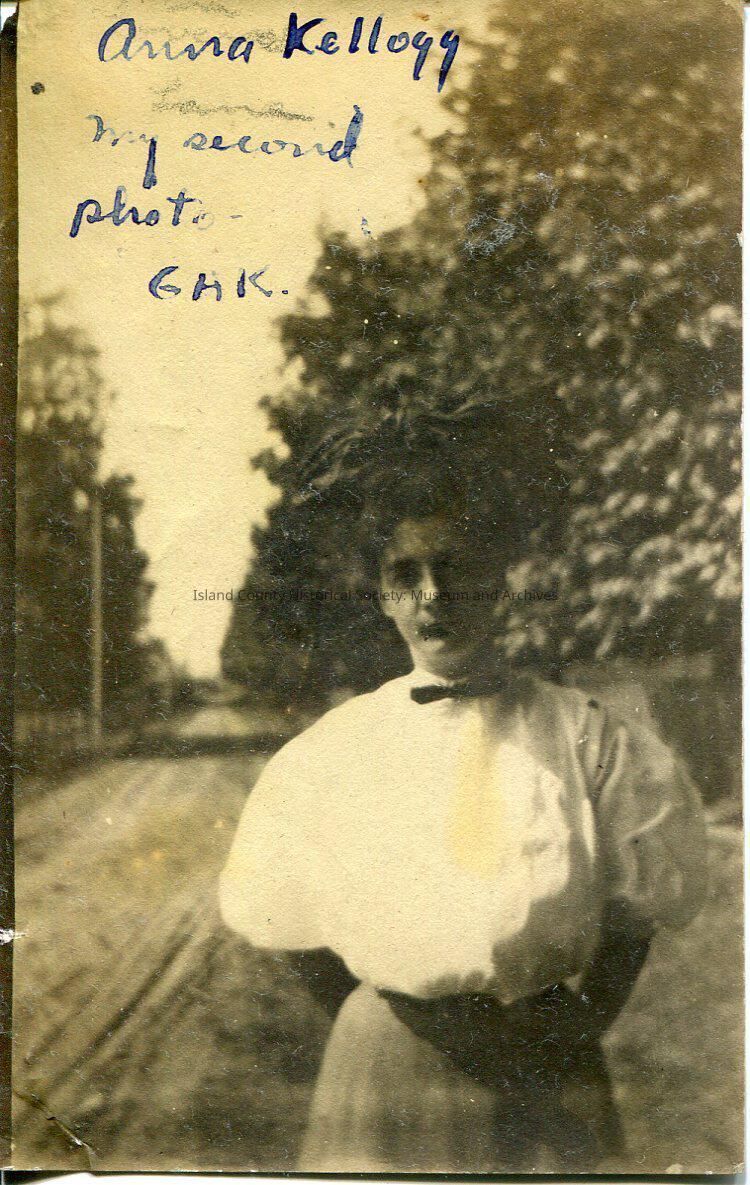 A black and white photo of a woman standing near a dirt road. The woman is wearing a skirt, a white blouse and a small tie. She also has a large bow/hat on her head. The top of the photo says, "Anna Kellogg, my second photo-GAK". The back of the photo says, "Mrs. Anna Kellogg Elder. Bellingham, Washington".Made/Created