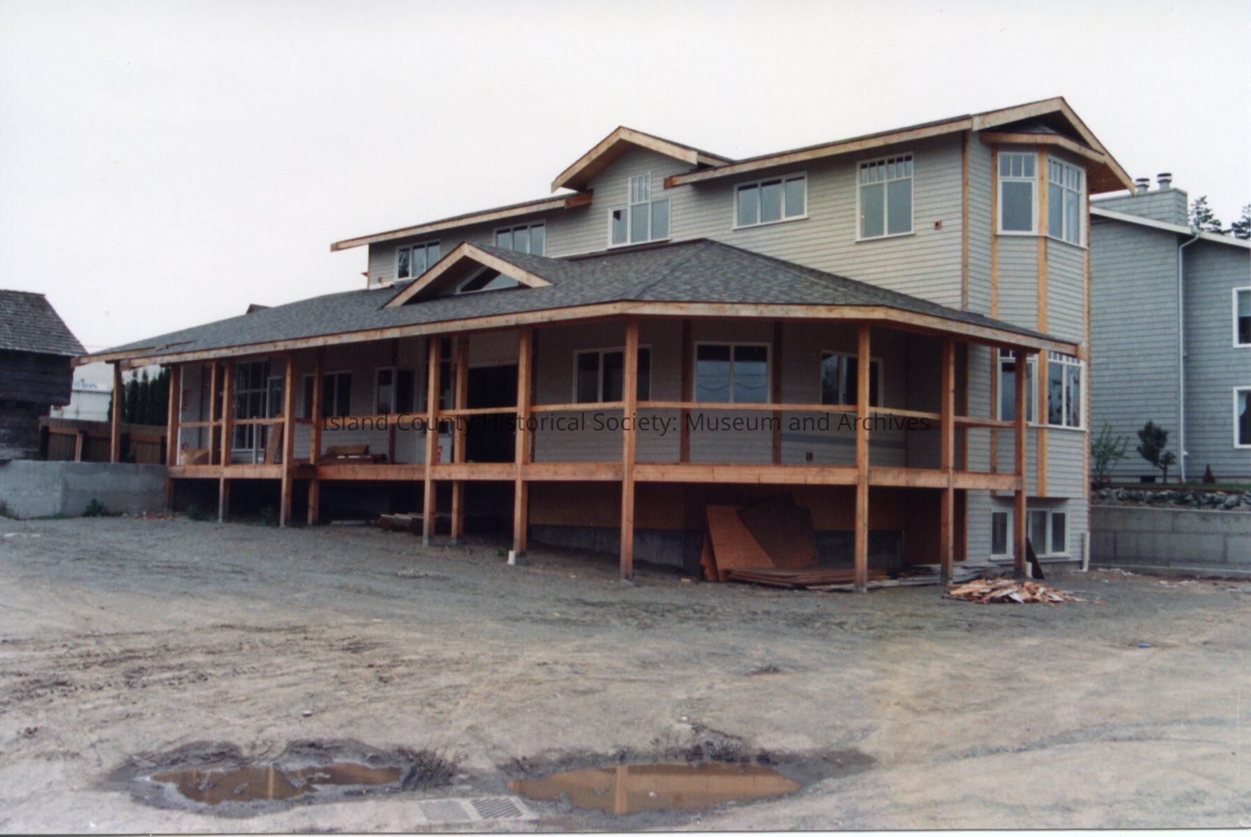 A photo of the museum being constructed. It appears to be showing a closeup of the front side of the museum. Part of the block house is on the left.