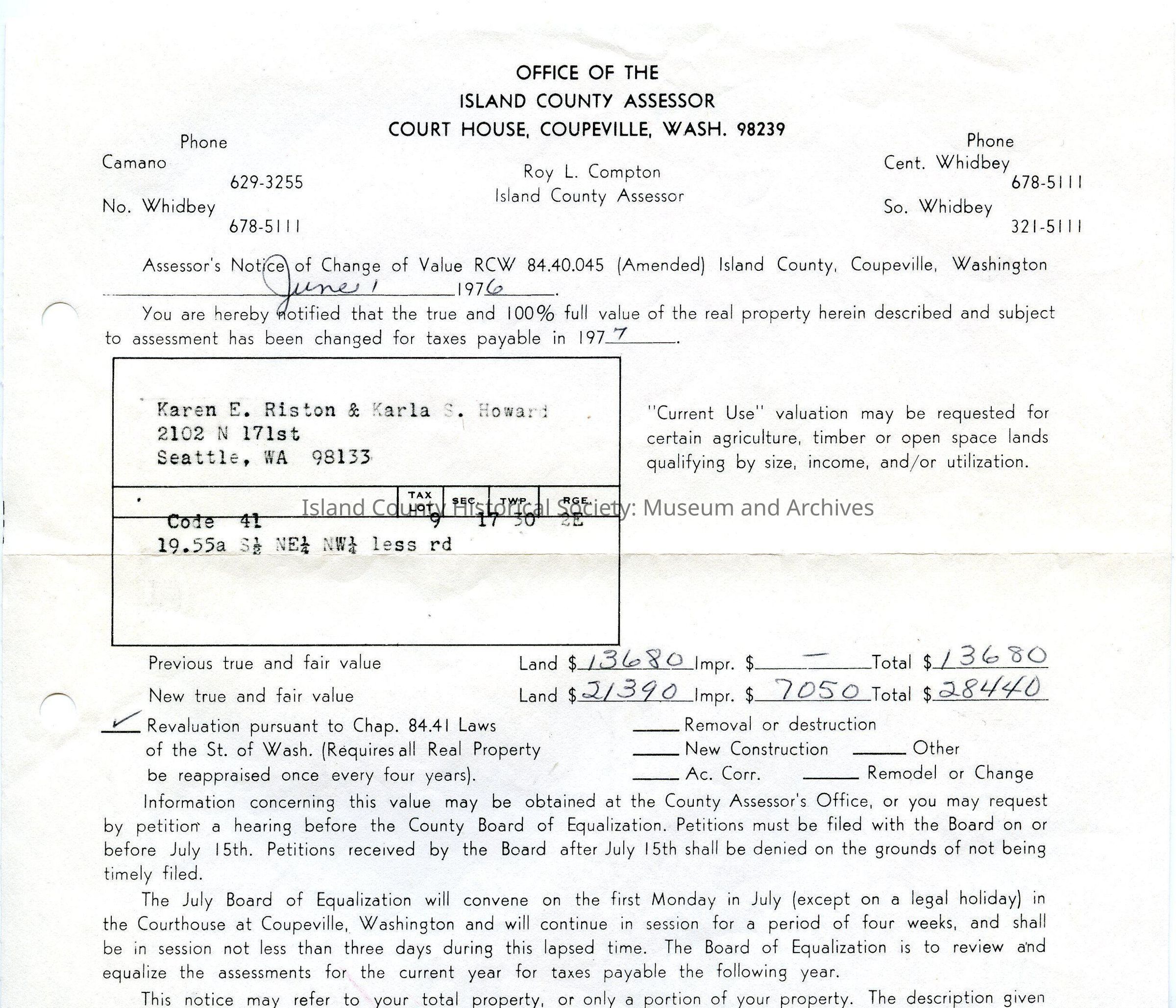 Assessor's Notice of Change of Value June 1st 1976 addressed to Karen Riston and Karla Howard. Handwritten in are the value the land was and the new true and fair value.