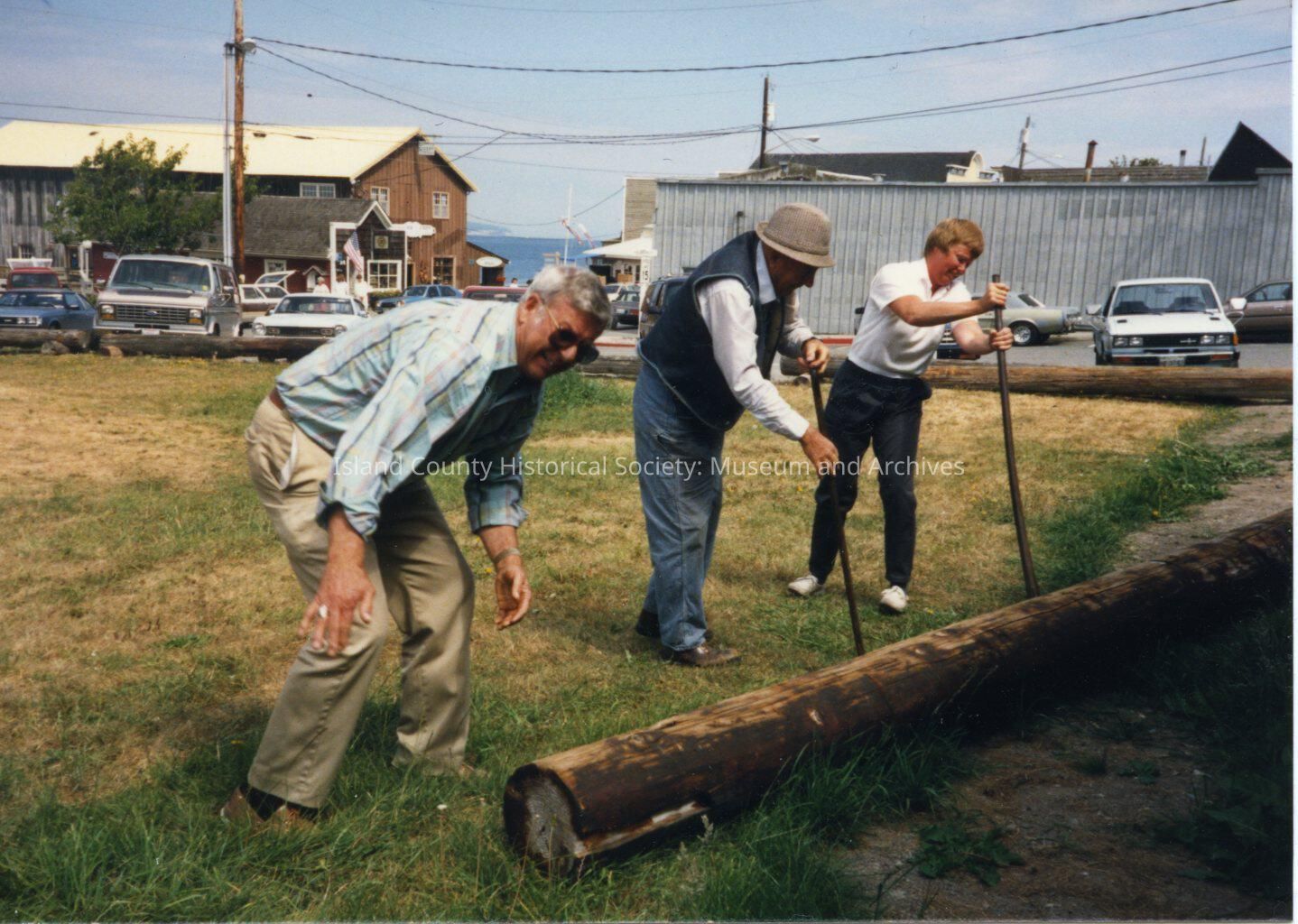 A photo of three people with a bending over a log with 'sticks' to move it. Hand written on the plastic cover is "Frank Lawhorn, John Hunt and Val Arnold get that pesky log out of the way."