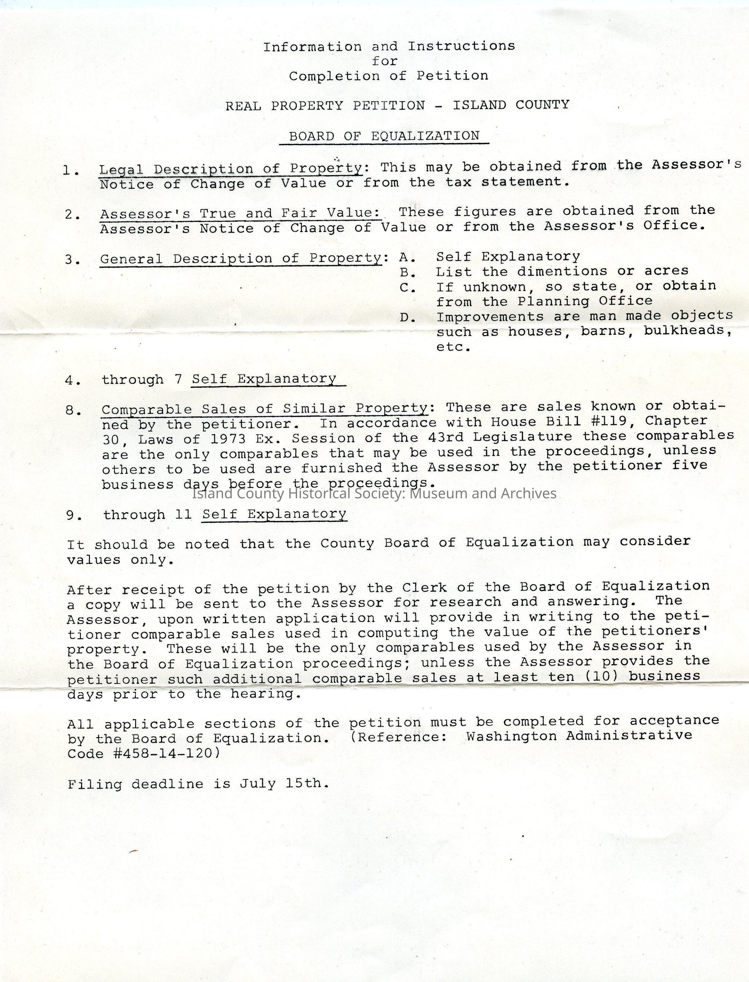 Information and Instructions for Completion of Petition (real property, Island County Board of Equalization). 9 bulletpoints detailing how to fill out the petition form as well as the filing deadline.