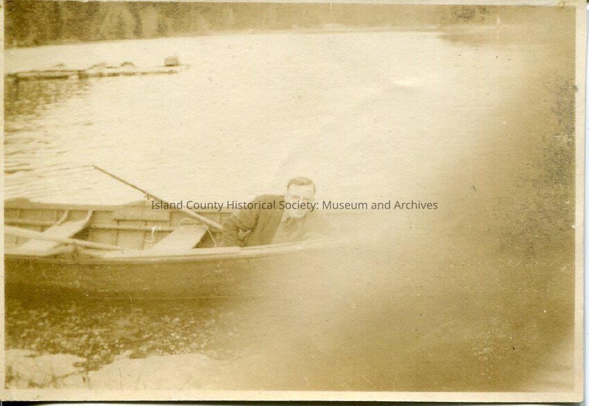 A man on a rowboat leaning down and smiling. The person holding the camera has their finger over half of the lens. Behind the man is a small view of trees outlining the water. Harold Kellogg.