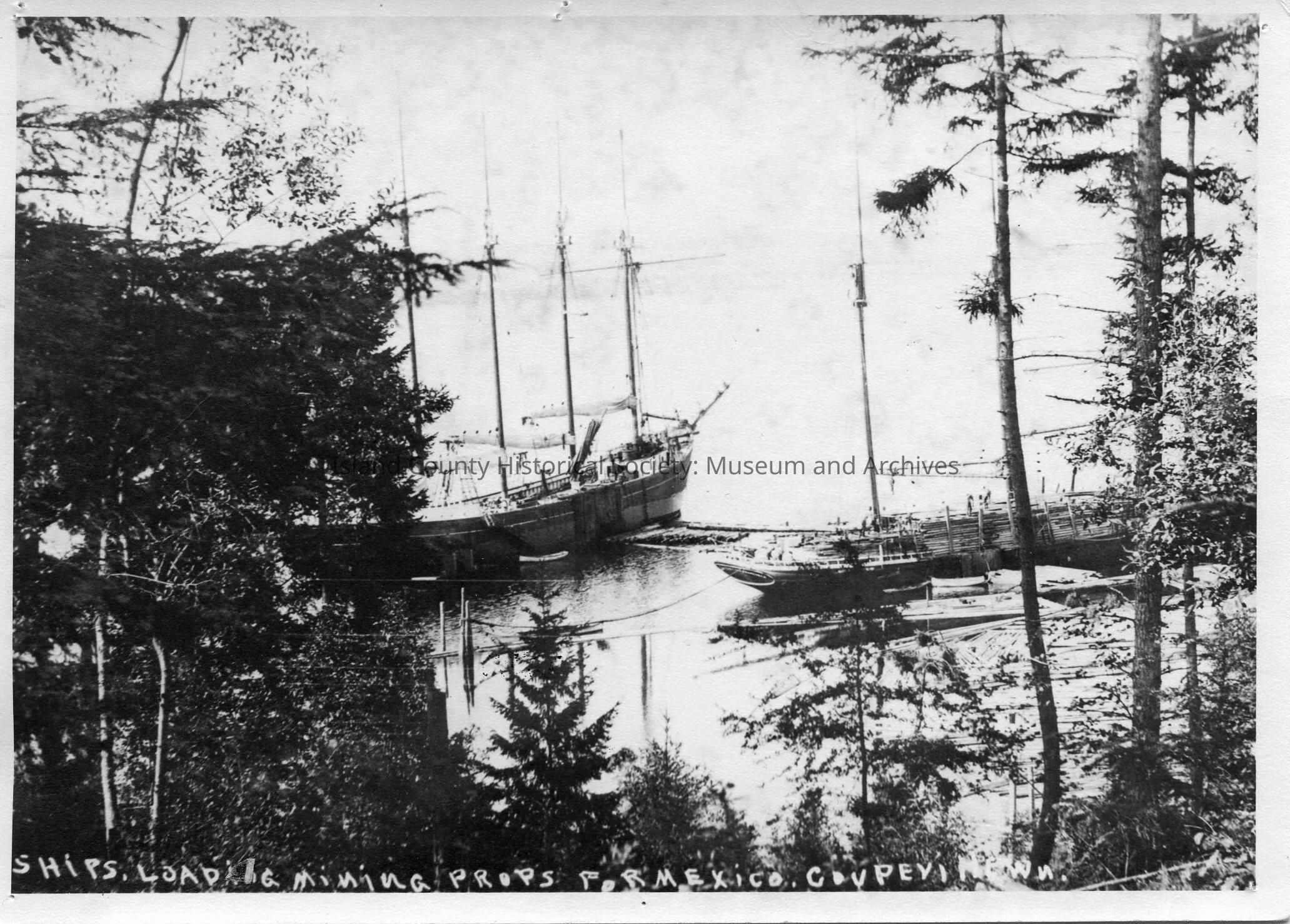 Two tall ships seen from shore through trees.The ship on the left has four visible masts and only two masts are visible on the ship on the right. They appear to be loading logs for a shipment. Caption states, "Ships loading mining props for Mexico, Coupeville WA." Back states." 1800s Penn Cove." "Billy Powell"