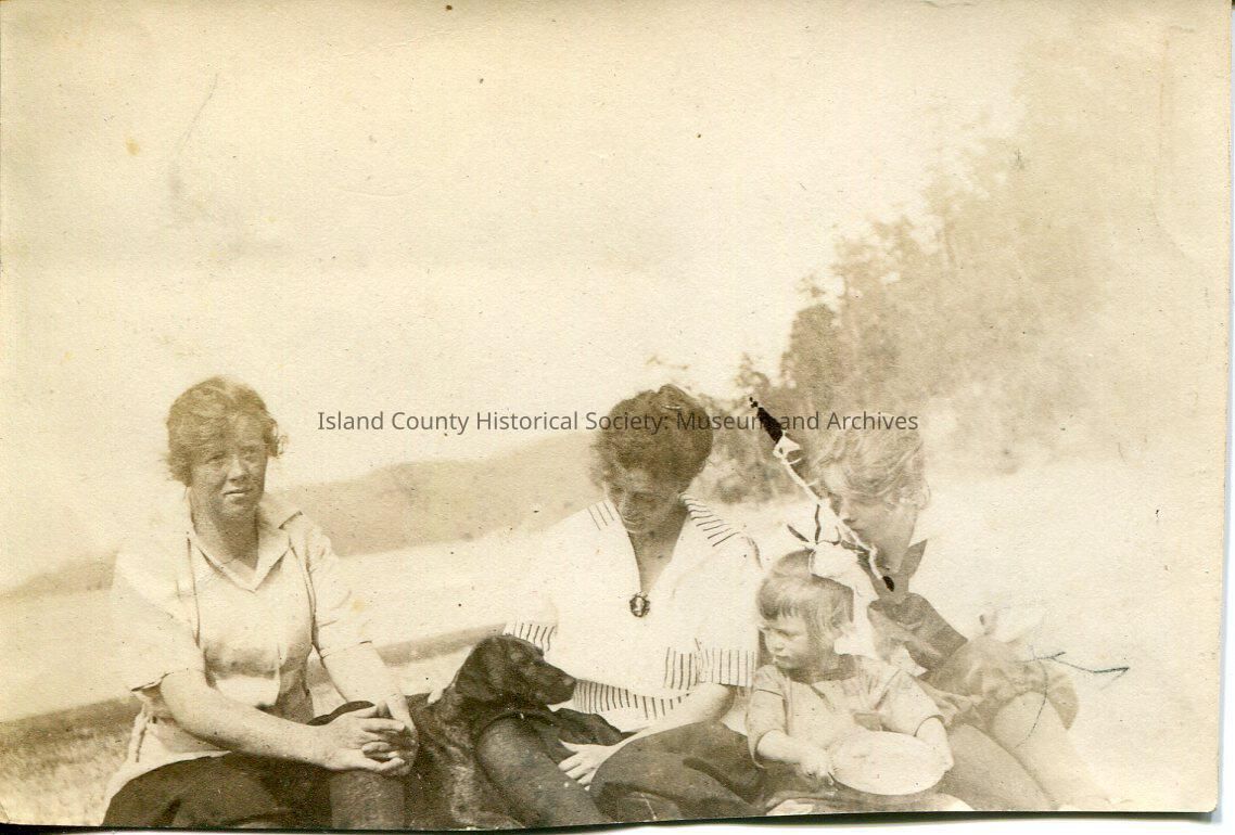 This black and white photo shows four young girls. Three of the girls look like teenagers and there is one child. All of the girls are wearing white tops with black pants. They also have all of their hair pulled back into a bun. The girls are on the beach with a large log stretching past the two older two girls. Three of the girls on the right side of the photo are looking down at a black dog that is sitting between the two older girls. Genevra Kellogg is on the left.