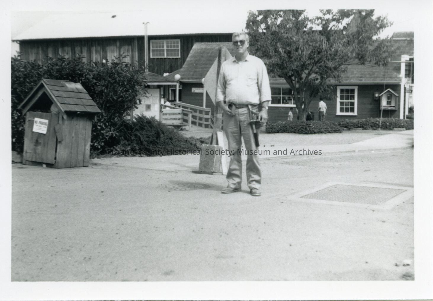 A photo of a man standing outside of several buildings. Looks to be a worker.