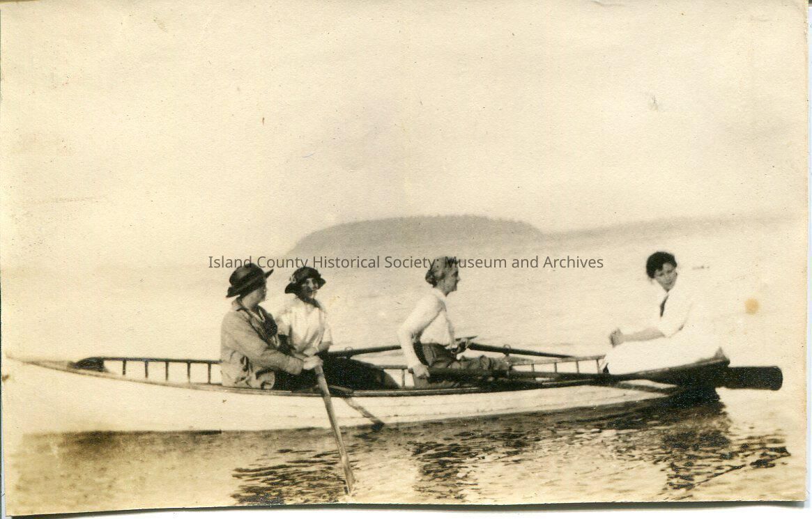 This black and white photo shows four people in a rowboat on a lake. The three people in the back of the rowboat are women and there is a man who is sitting at the front of the boat. The women are wearing white shirts which are tucked in to their long black skirts. They also have their hair pulled back into a bun. The two women in the back of the boat are both wearing hats, the one on the left is wearing a coat. The man at the front of the boat is wearing a long white coat and a black tie. On the right side of the boat is a railing. Behind the people is another island.
