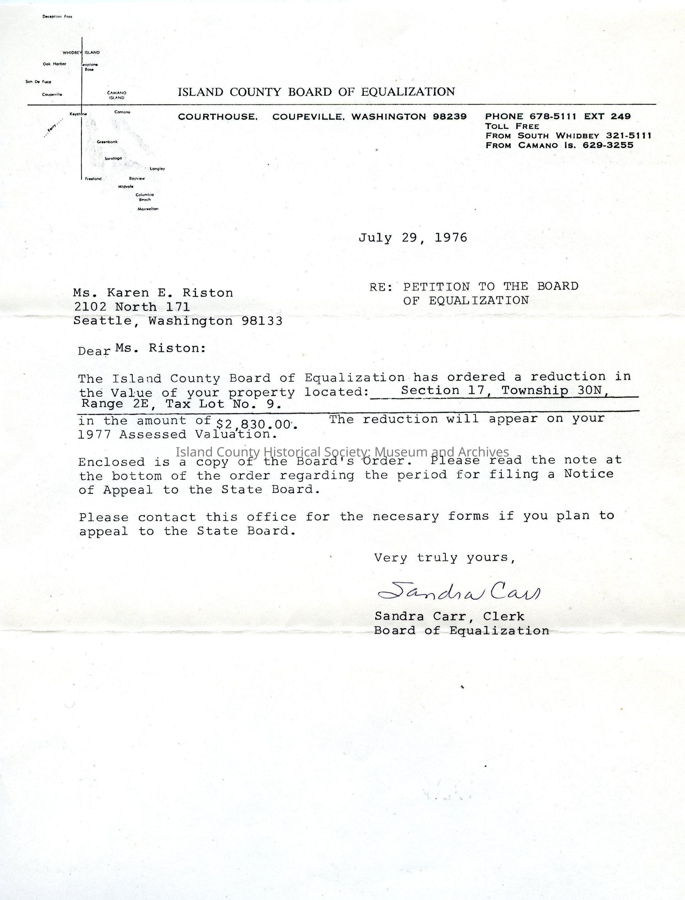Letter from the Island County Board of EQualization to Karen Riston dated July 29 1976 regarding her petition to the board about her property valuation. States the reduction in value and the board's order is attached (.27c)
