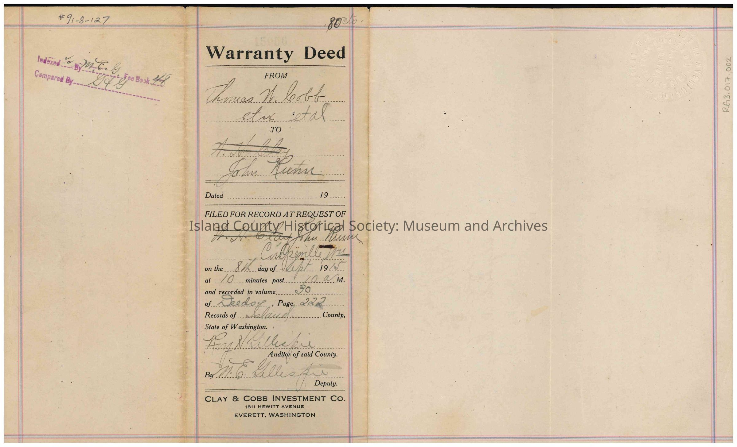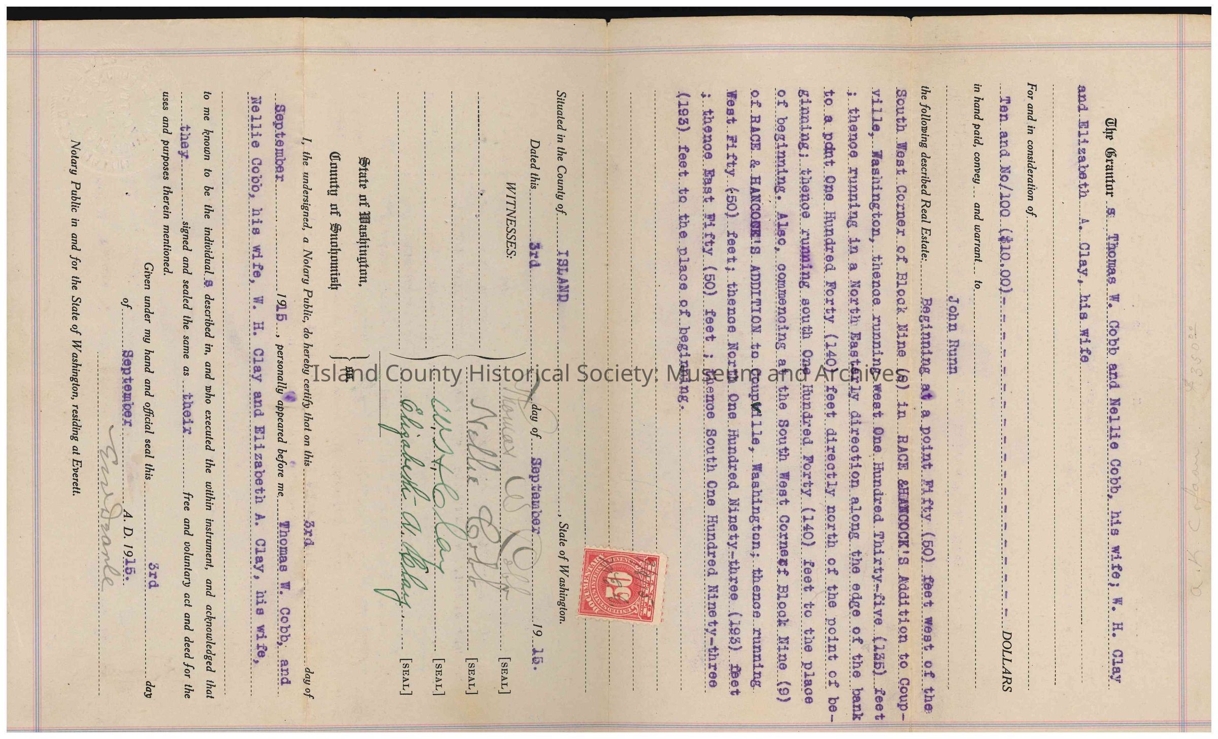Warranty Deed from Thomas W. Cobb, Nellie Cobb, W. H. Clay, Elizabeth A. Clay to John Runn, c. 3rd September 1915. This Warranty Deed is for the value of $10.00 dollars and for the following portions of land in Island County: "Beginning at a point Fifty (50) feet west of the South West Corner of Block Nine (9) in RACE & HANCOCK'S Addition to Coupeville, Washington, thence running west One Hundred Thirty-five (135) feet; thence running in a North Easterly direction along the edge of the bank to a point One Hundred Forty (140) feet directly north of the point of beginning; thence running south One Hundred Forty (140) feet to the place of beginning. Also, commencing at the South West Corner of Block Nine (9) of RACE & HANCOCK'S ADDITION to Coupeville, Washington; thence running West Fifty (50) feet; thence South One Hundred Ninety-three (193) feet; thence East Fifty (50) feet; thence South One Hundred Ninety-three (193) feet to the place of beginning."Collection