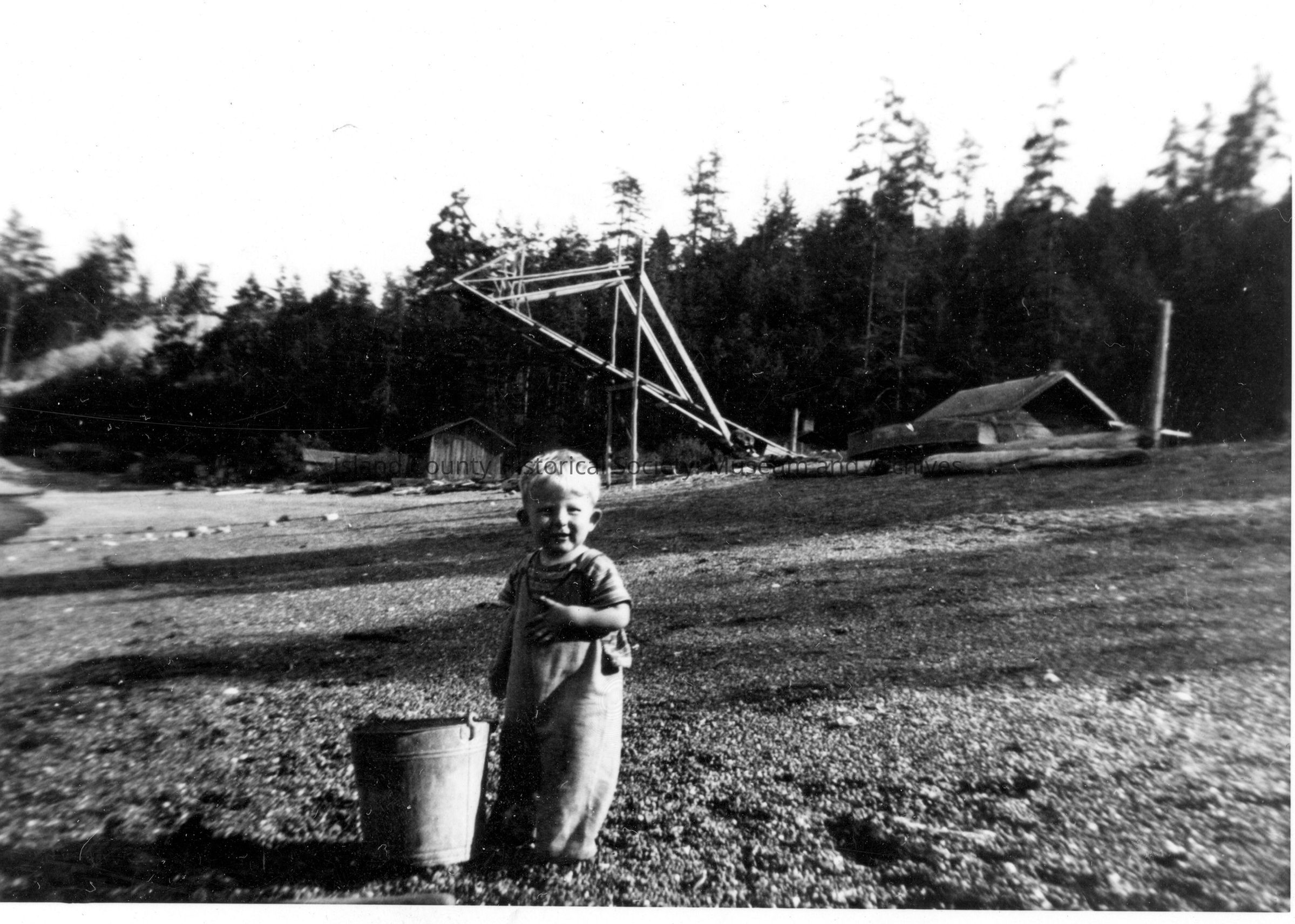 Fish lookout at Good Beach, Pratt's boat house. Marcia & Eric Vercoe & friend sitting on beach holding star fish.