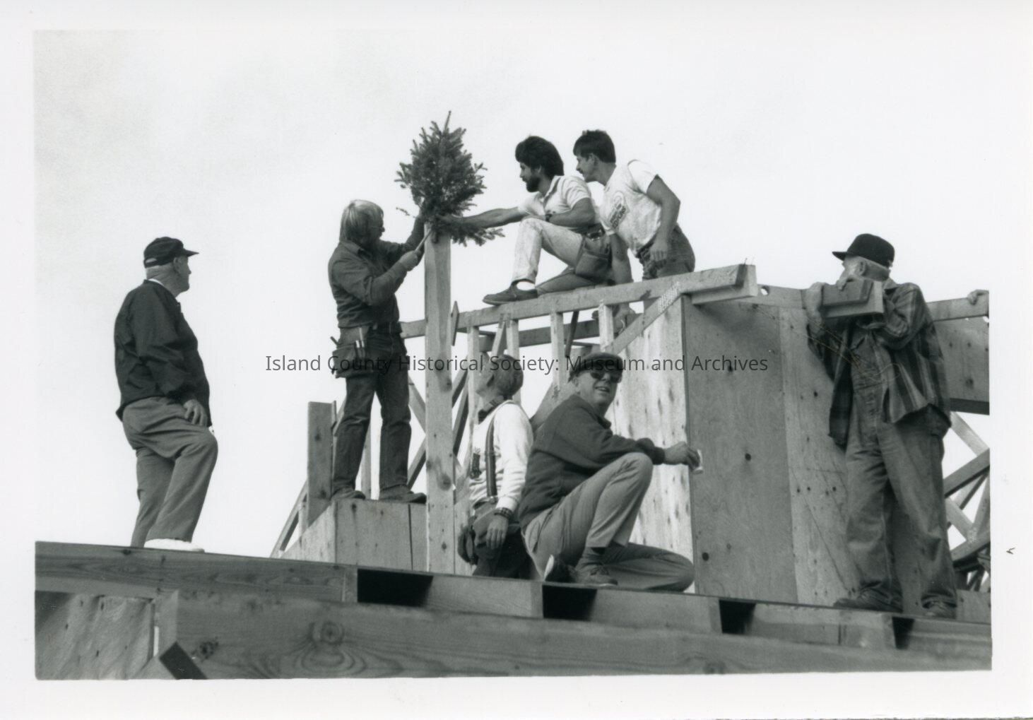 A photo of a six people on a wooden part of a building, holding an evergreen plant.
