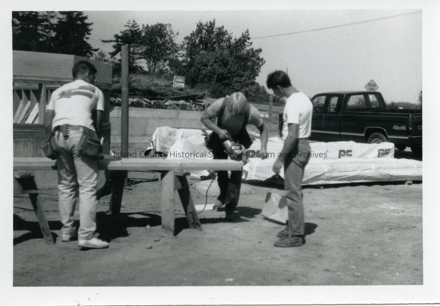 A photo of three men standing at a sawhorse with wood on it. They are working on the wood, In the background is a truck.
