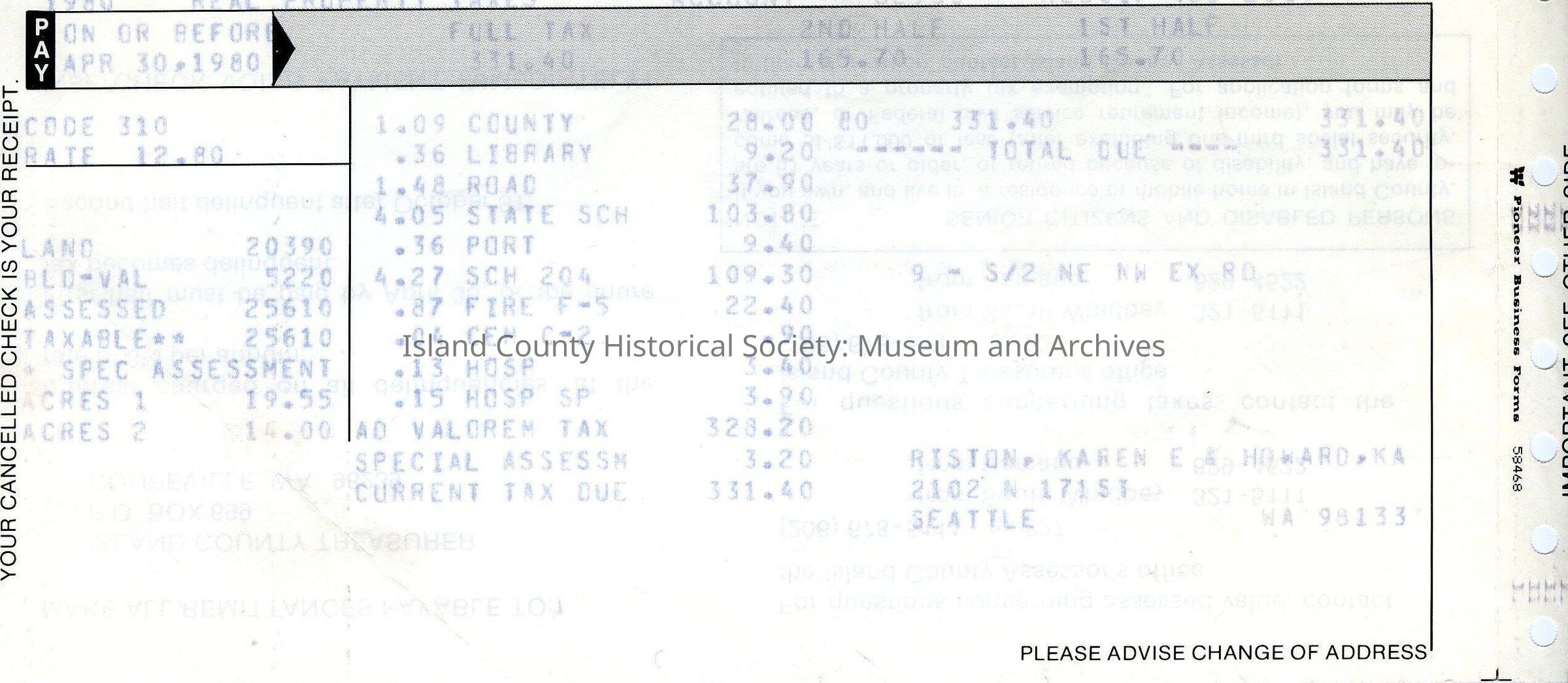 1980 Real Property Taxes statement/receipt from Island County Treasurer to Karen Riston and Karla Howard. Provides how much money is going to local services and how much is owed in full.
