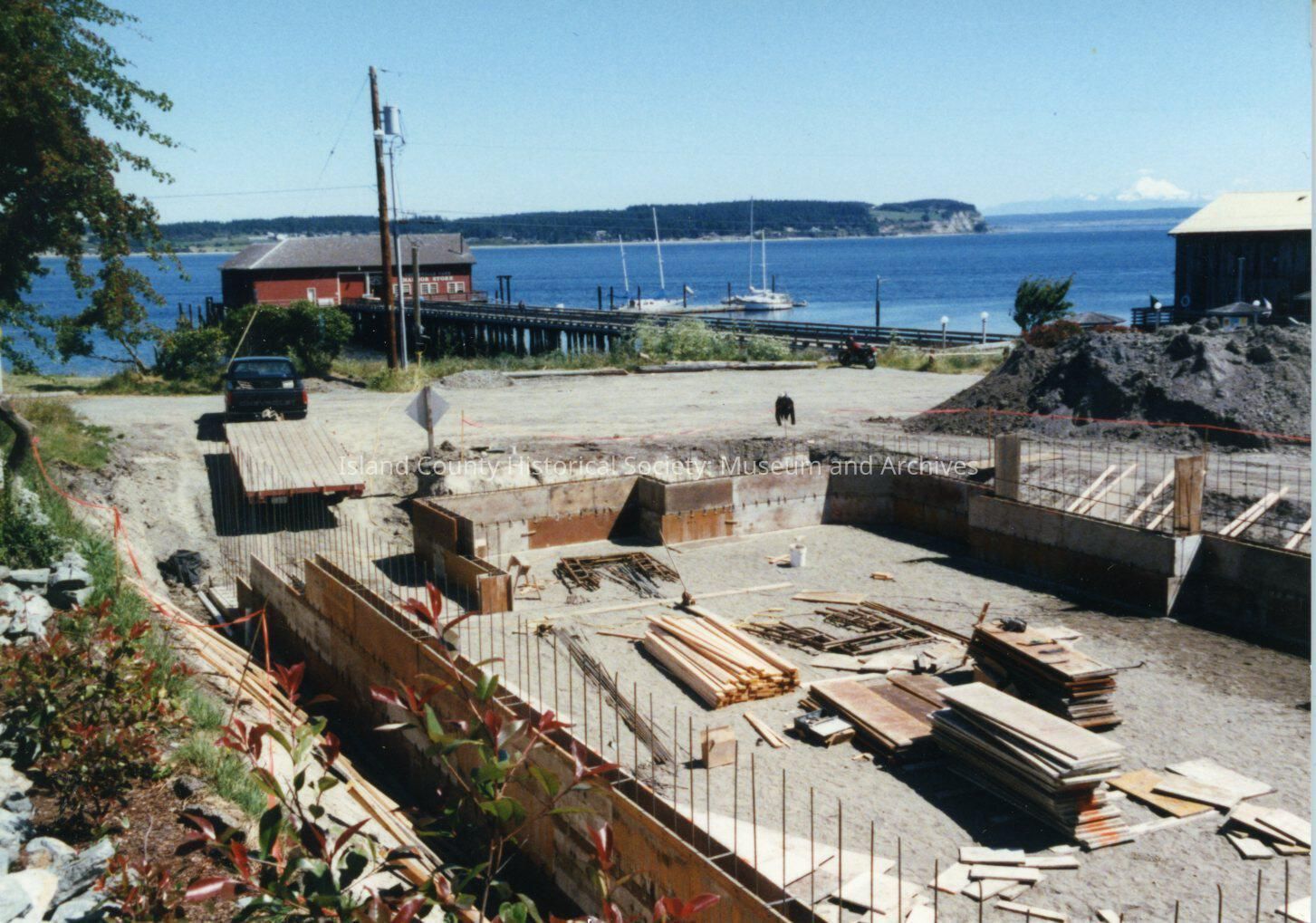 A photo of the foundation of the new museum. In the background is the dock and the warf and water.