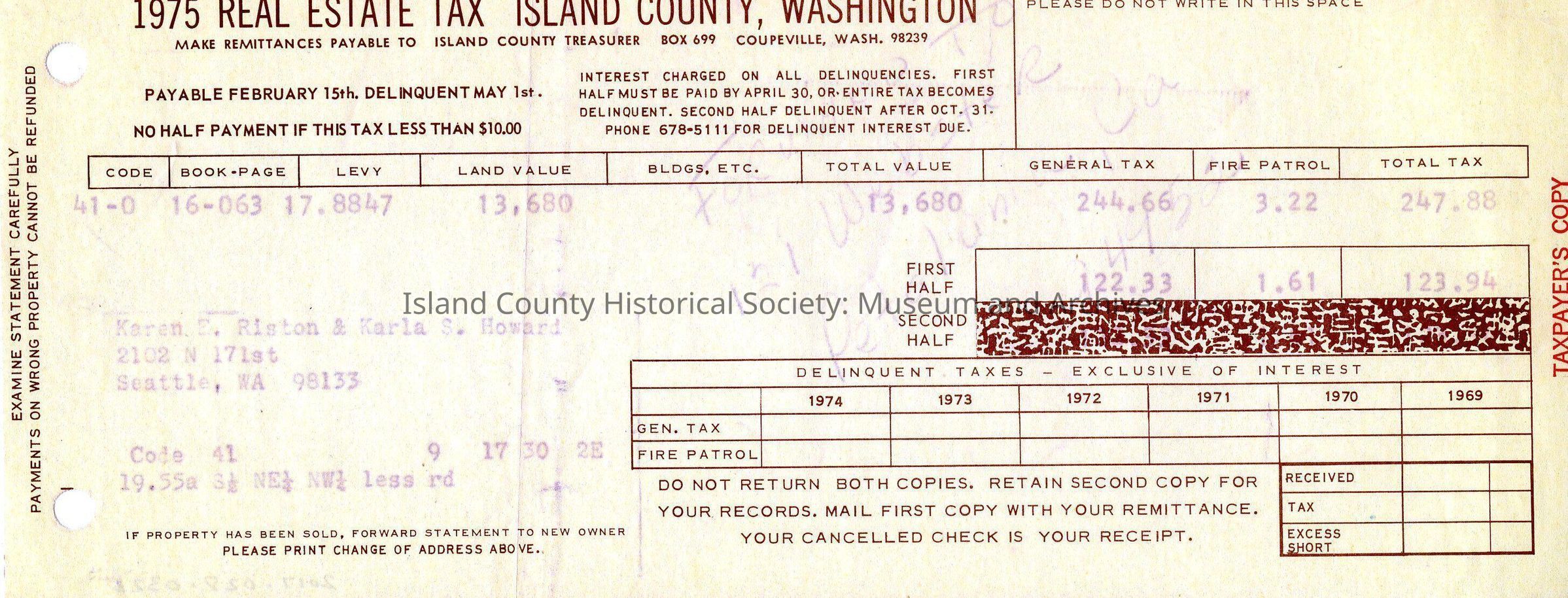 1975 real estate tax island county statement for Karen Riston and Karla Howard, brown printed info but spaces filled with typewritten words, including the code for their property, book page, levy, land value, total value, general tax, fire patrol and total tax owed.Lexicon