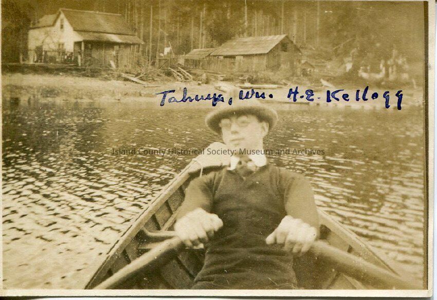 This black and white photo shows a man rowing a boat. The man featured is H. E. Kellogg (Harold Eugene Kellogg). Kellogg is wearing a sweater with a white collar poking out from underneath his sweater, he also has on a circular hat and round glasses. Kellogg is not looking directly at the camera but a bit to the left, and behind him are two buildings.