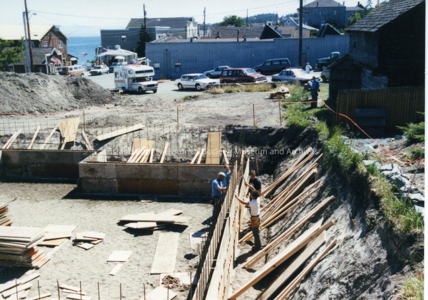A photo of the foundation of the new museum. There are several men working on it. On the right is the blockhouse.