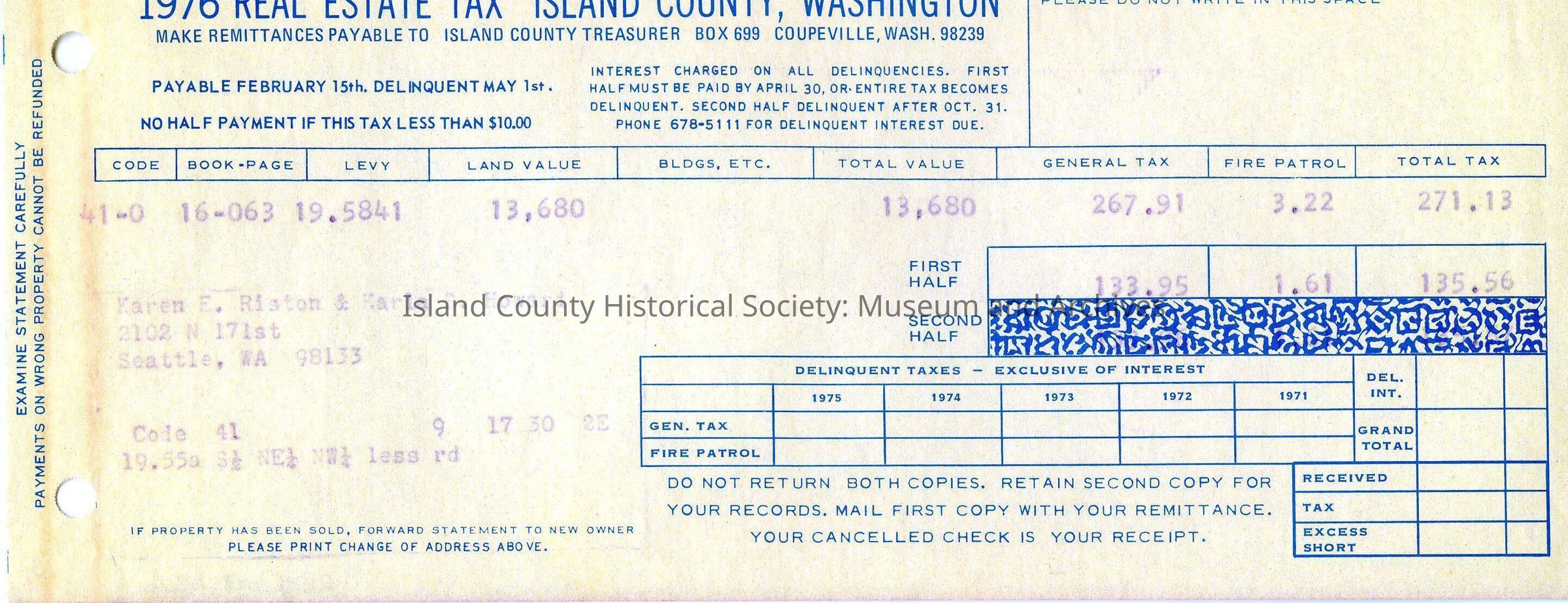 1976 real estate tax island county statement for Karen Riston and Karla Howard, blue printed info but spaces filled with typewritten words, including the code for their property, book page, levy, land value, total value, general tax, fire patrol and total tax owed.Lexicon