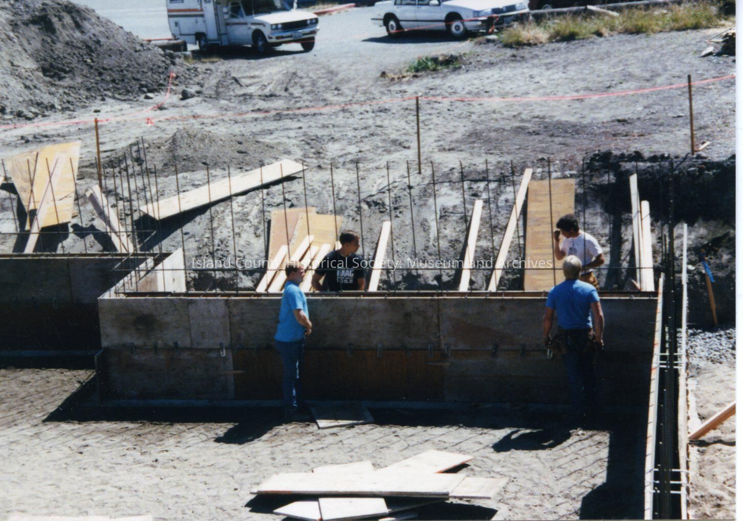 A photo of the foundation of the new museum. There are several men working on it.