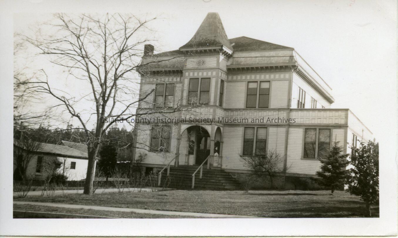 The 1891 Lovejoy Courthouse seen before it was torn down in 1949. This photo is looking at the front steps from the street. There is a one level addition to the right of the building (viewers perspective). It was taken in winter or spring as the tree in front of the courthouse has no leaves.