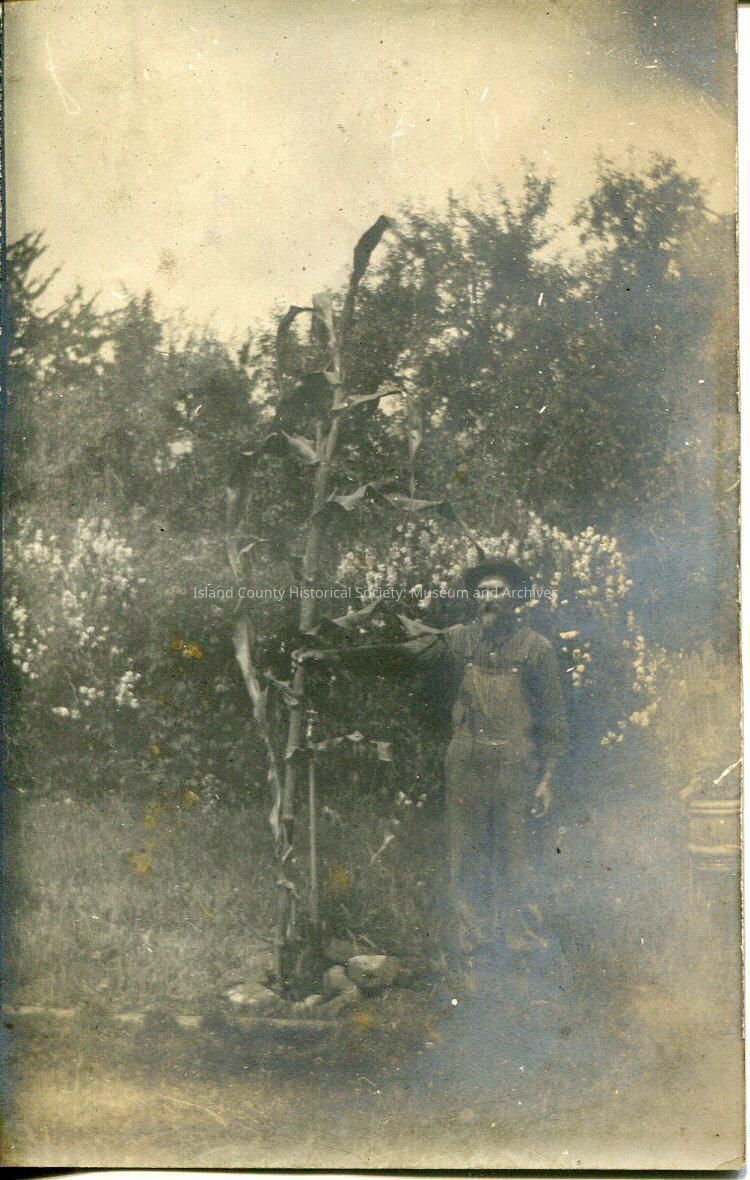 This black and white photo shows an old man standing next to a tree. The man is wearing overalls and a circular hat. His left arm is stretched out holding the tree. Behind the man is white flowers sticking out of a bush, and behind the bush are large trees.