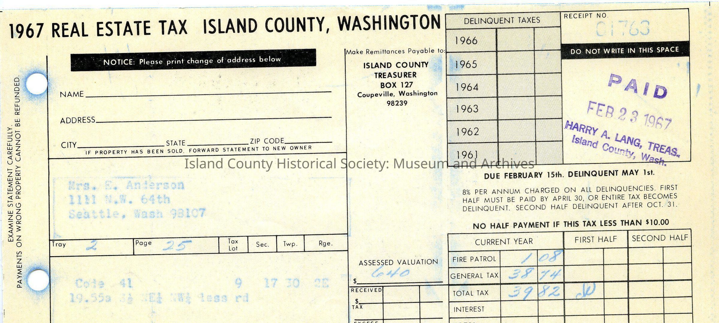 1967 real estate tax Island County statement addressed for Mrs E Anderson, black print but blue typewritten info in spaces available. Notes fire patrol, general tax, assessed valuation of property and total tax. Paid date in upper corner stamped in purple .Lexicon