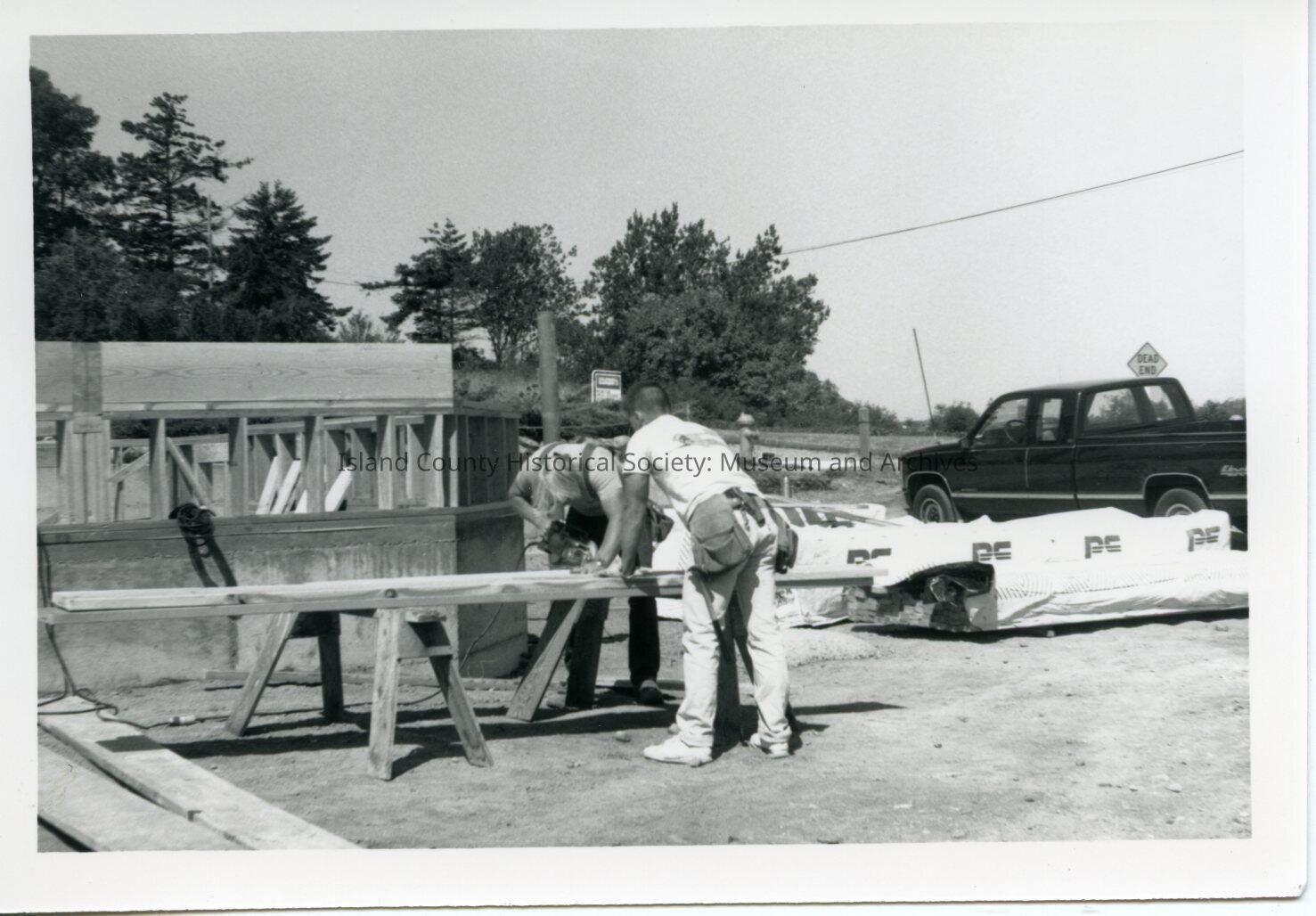 A photo of a couple of men bending over a sawhorse working on a piece of wood. Black truck is on the right.