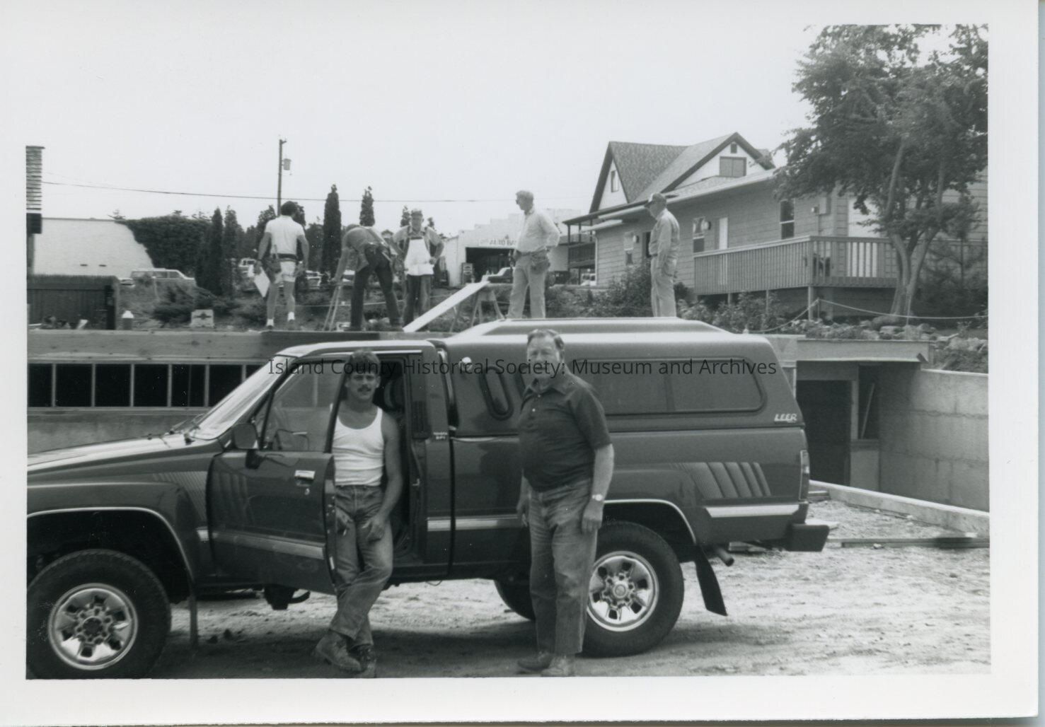 A photo of two men standing by and sitting in a truck. In the background are other men working on the foundation of the new museum.