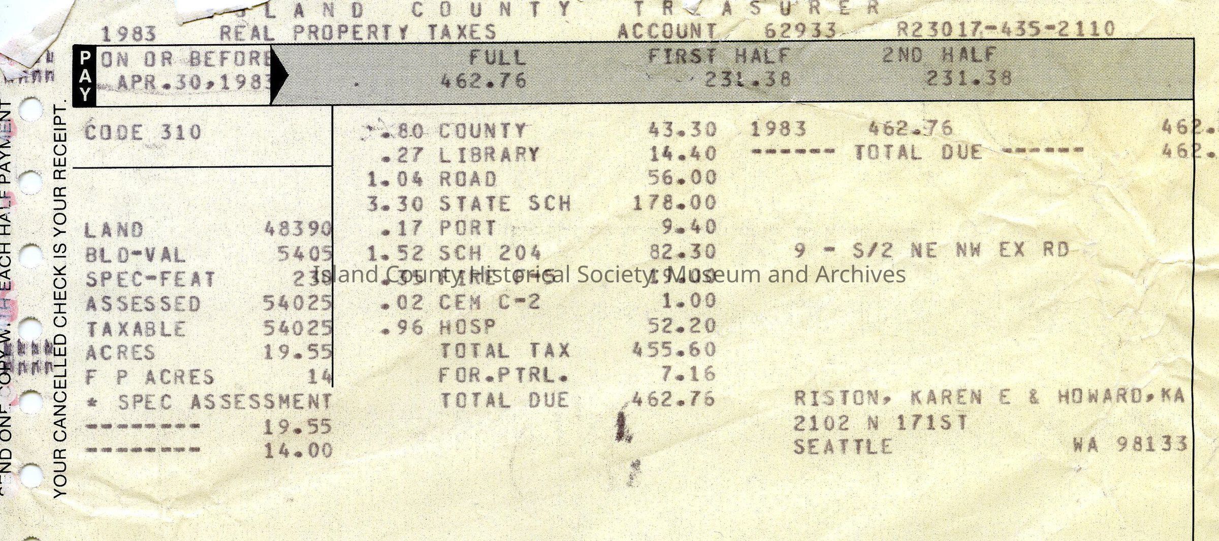 1983 Real Property Taxes Island County addressed to Karen Riston and Karla Howard. Notes how much is owed to each public service, value of property and total tax owed