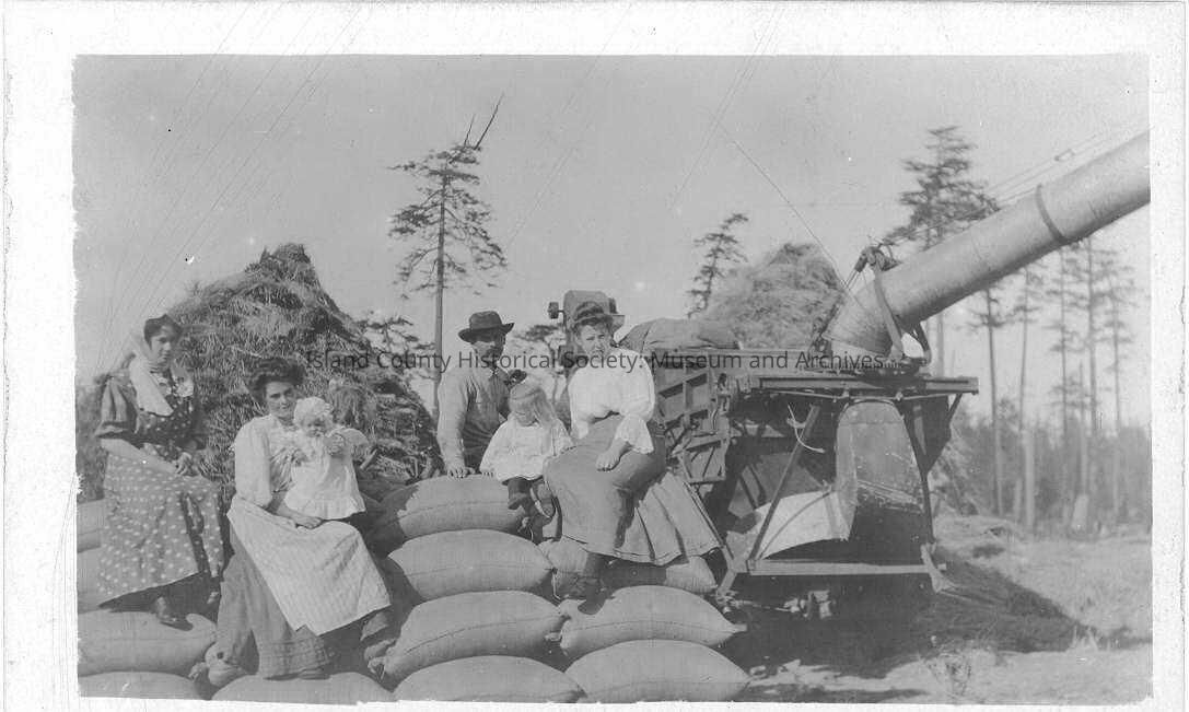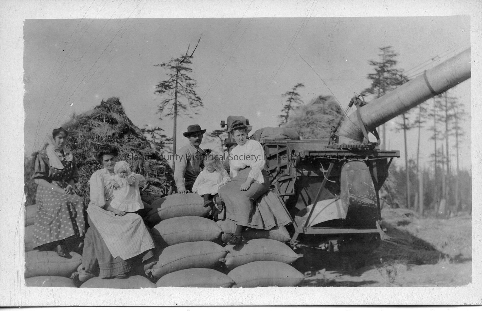 A postcard photo of a machine and people sitting on the full bags. A man, three women and a small girl and infant. Handwritten on the back is "Threshing on Beach View Farm."Made/Created