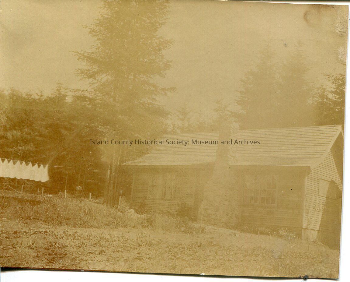 This black and white photo shows a house. There is a chimney halfway on the side of the house. the house has a slanted roof, next to the house is a large tree and several more trees are behind the house. Next to the tree is a white fence.