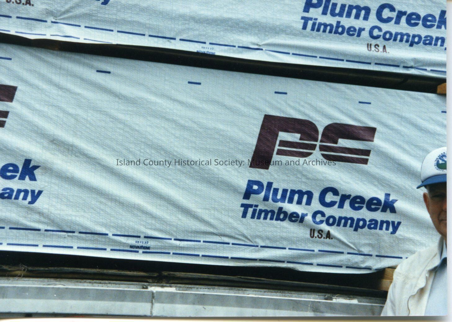 A photo of a stack of covered wood called Plum Creek Timber Company. Just on the right is part of a man.