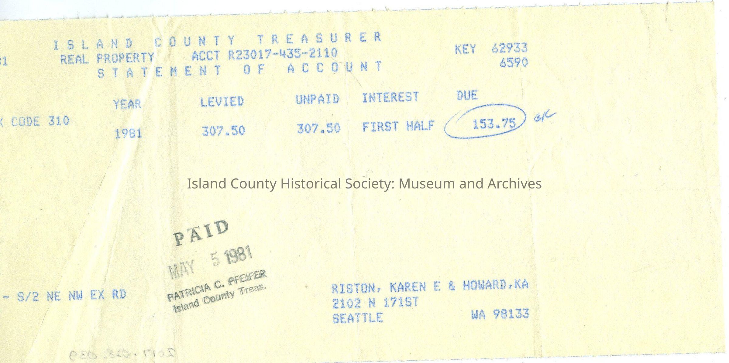 1981 Real Property Taxes Island County receipt for part payment of tax and stamped when it was paid.