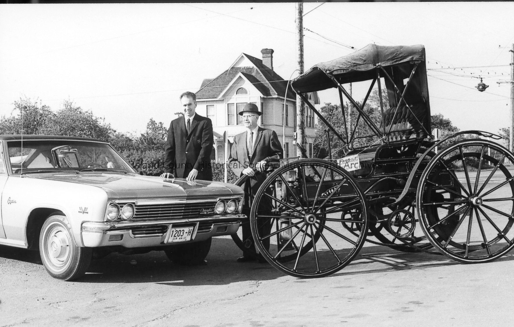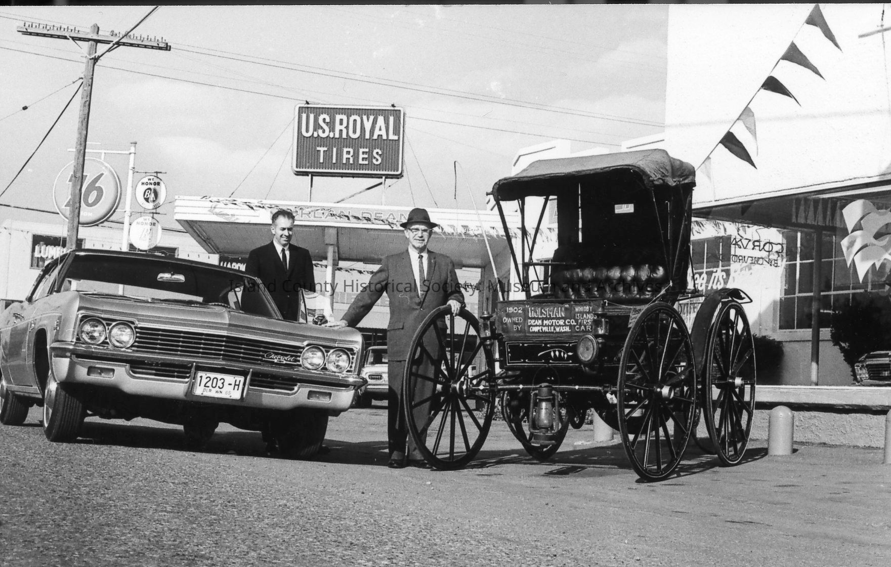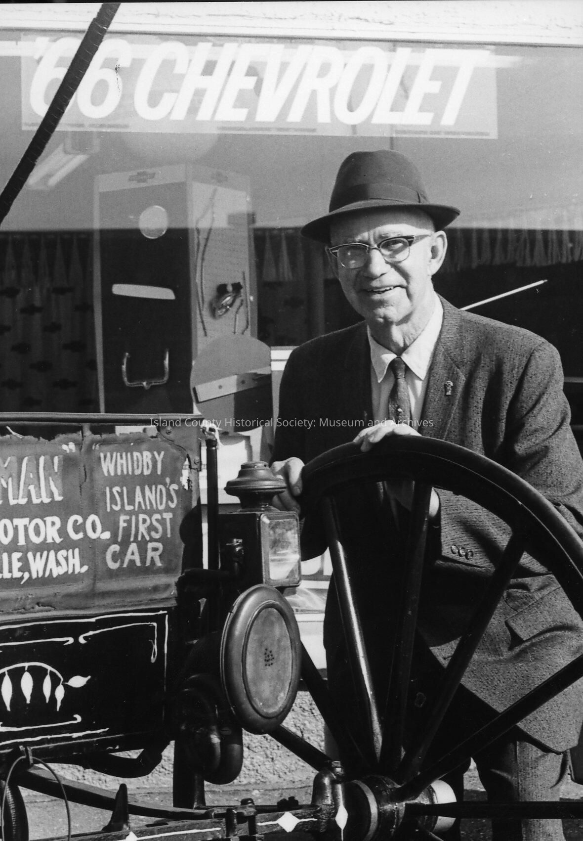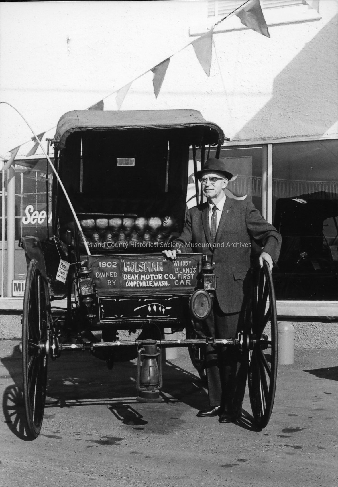 Carl Dean stands beside 1902 Holsman Car at Dean Motor Co. at Prairie Center. Whidby Island's first car. Sign on building reads '66 Chevrolet.Photograph Details