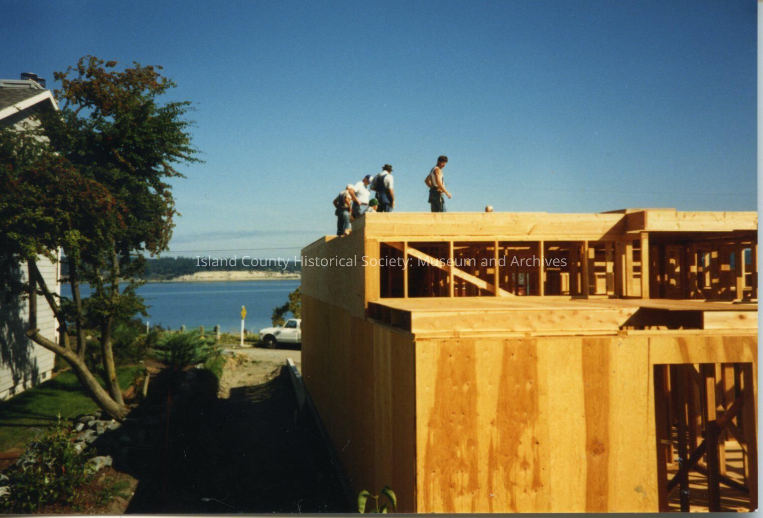 A photo of some workers on top of the wooden museum. The sky is blue and water is seen in the backgound.