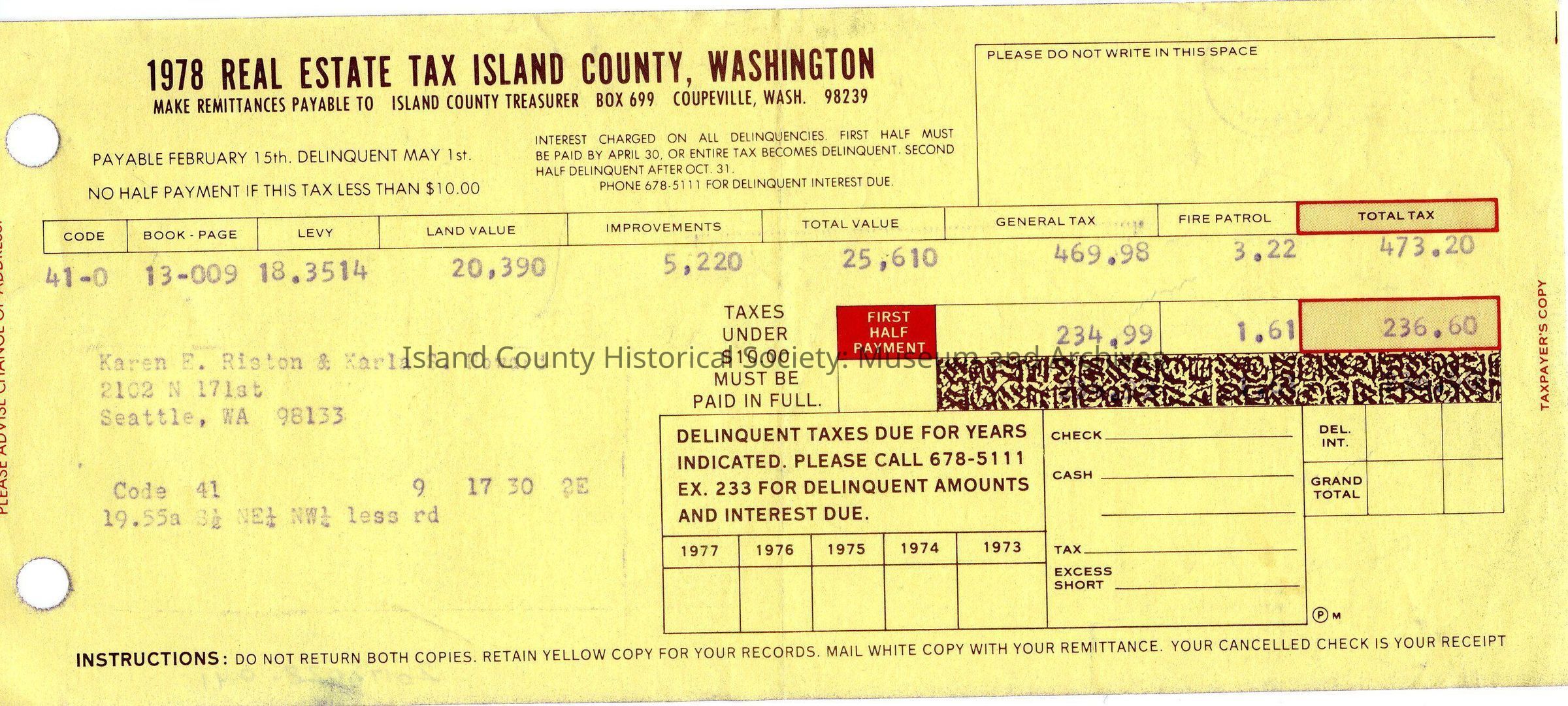 1978 Real Estate Taxes Island County statement addressed to Karen Riston and Karla Howard showing amount of tax owed to each public service, land property value and total tax due.